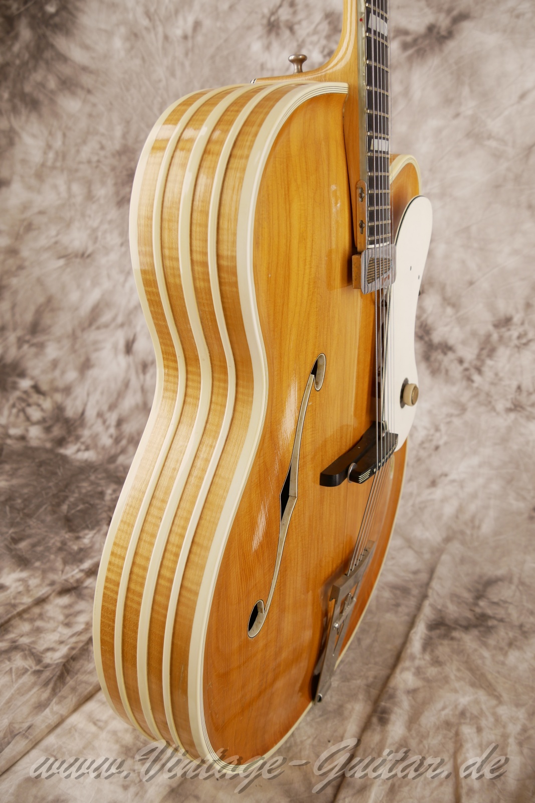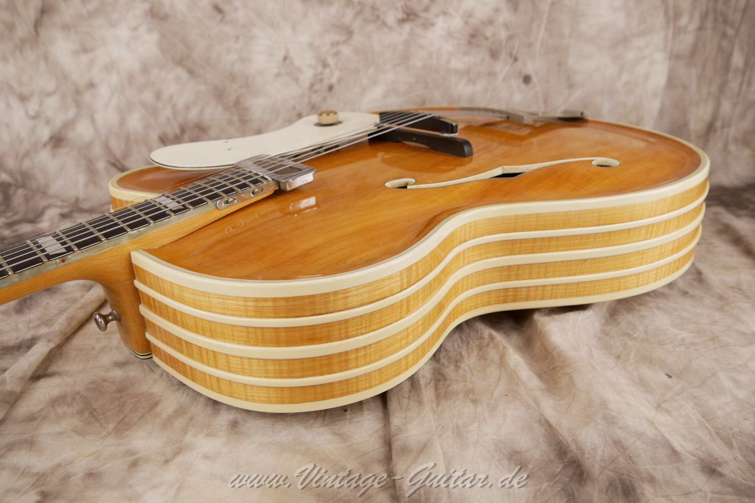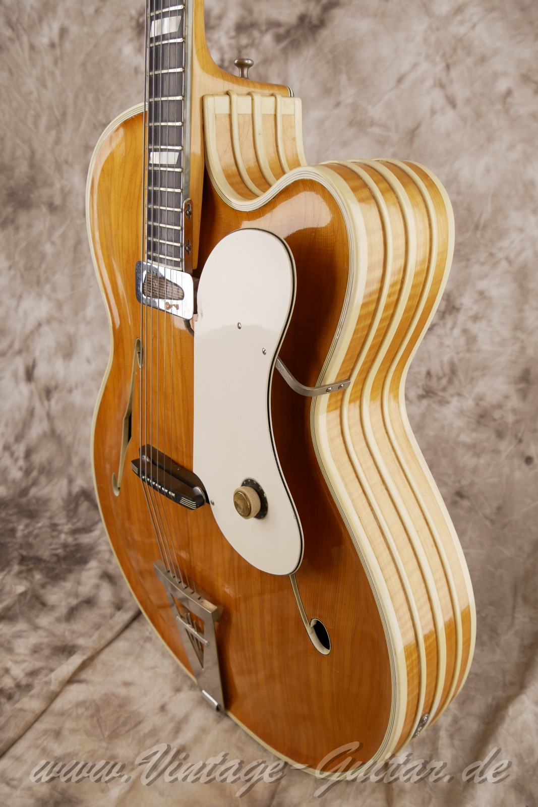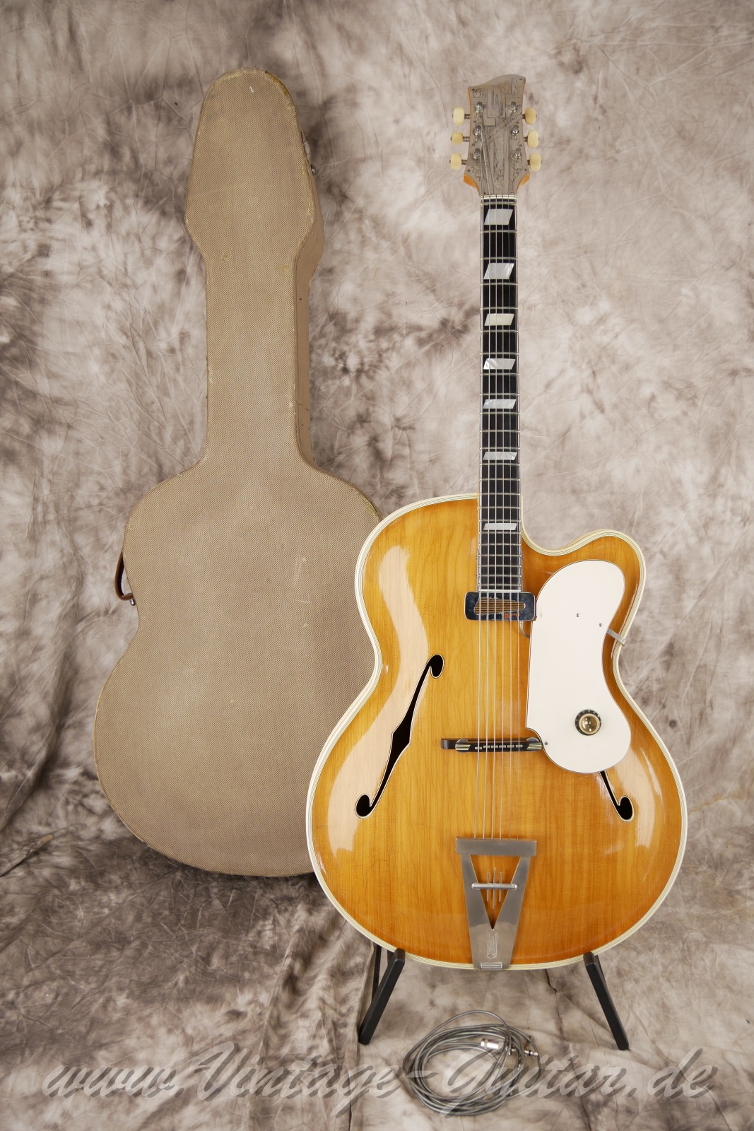 comes with original case [classif. exc ] Masterpiece of legendary Arthur Lang, solid carved spruce top and solid carved maple back. King of German Archtops. Rare model w. f-holes and chiseled headstock overlay.Pickup from an unknown manufacturer "Dyna(cord)"?Comes with adapter cable for the pickup and orig. case.
