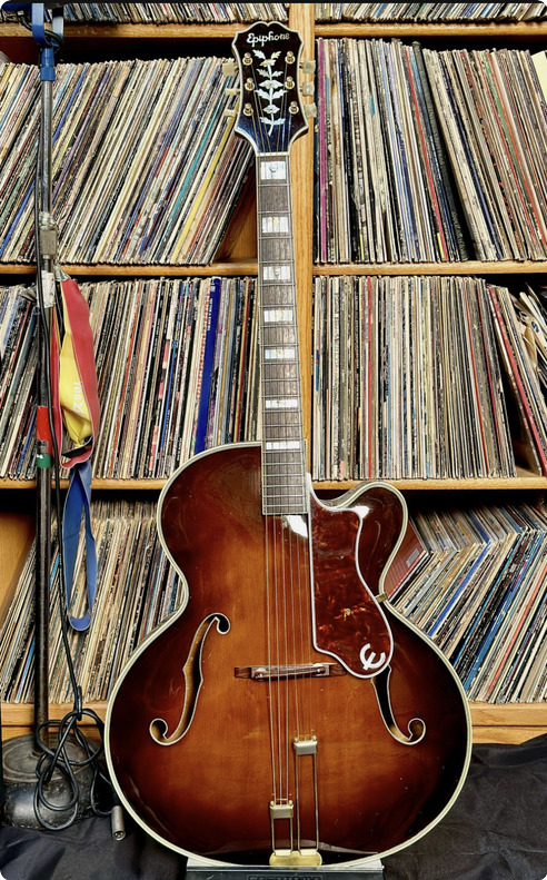 Here we have a 1949 Epiphone Emperor Cutaway from a collection, complete with its original brown case. Based on the online Epiphone serial number database, the earliest listed serial number is 59092, and this guitar is serial #59079, which makes it the earliest known production date according to that reference.