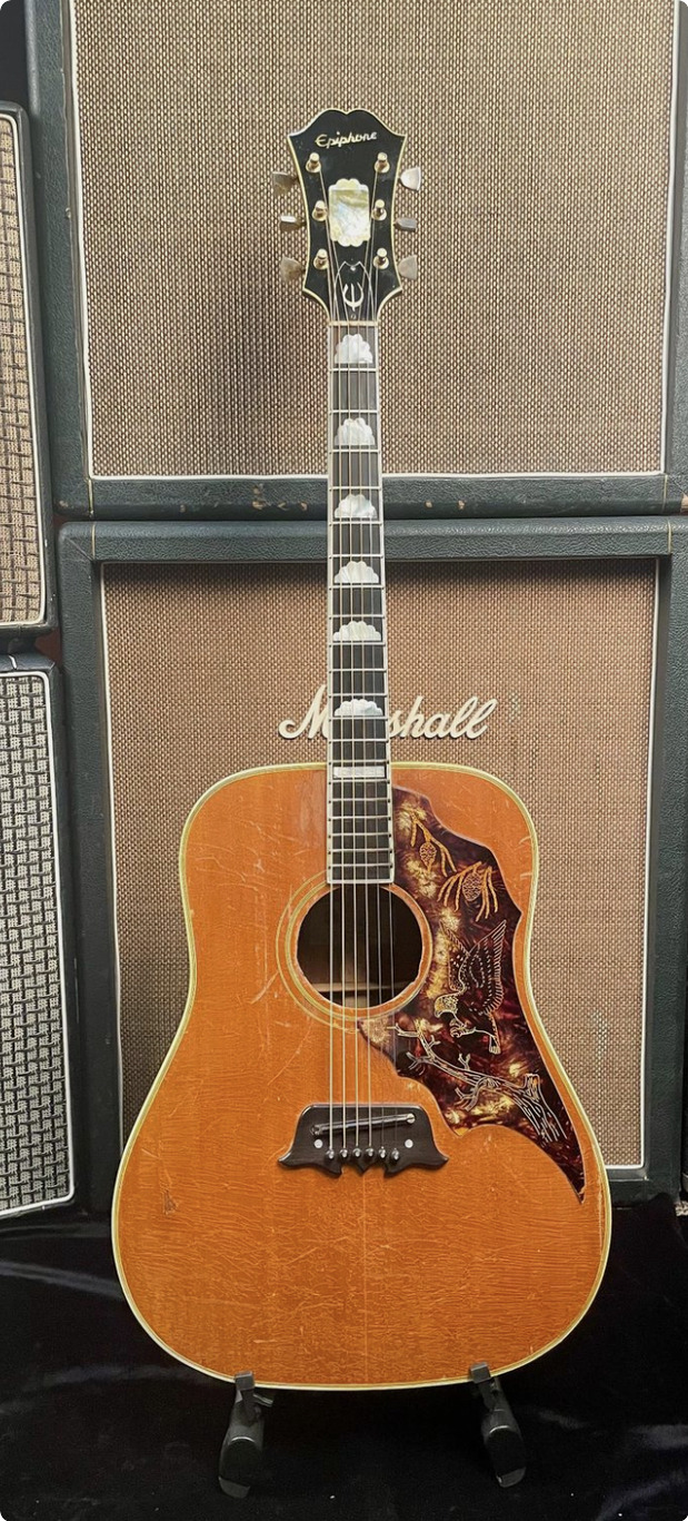 The Excellente was among the most expensive Gibson-produced guitars when new in the 1960s, designed as an ornate Gibson/Epiphone take on Martin’s pre-war herringbone D-28 style. They’re extremely rare, with total production stated as only 139 made from 1963–1969 and this is a first for us.