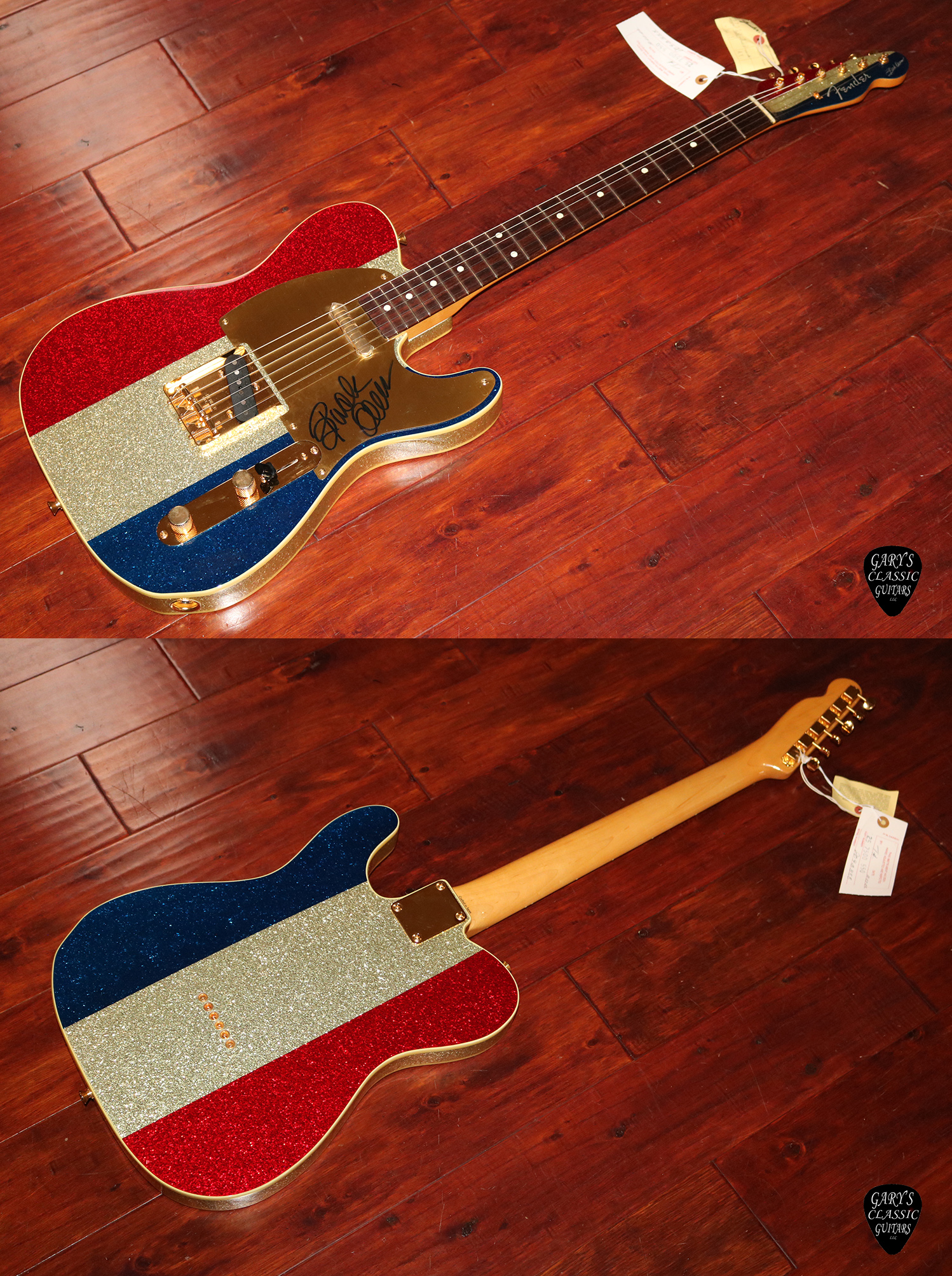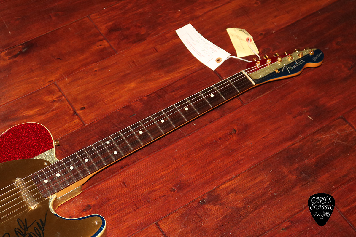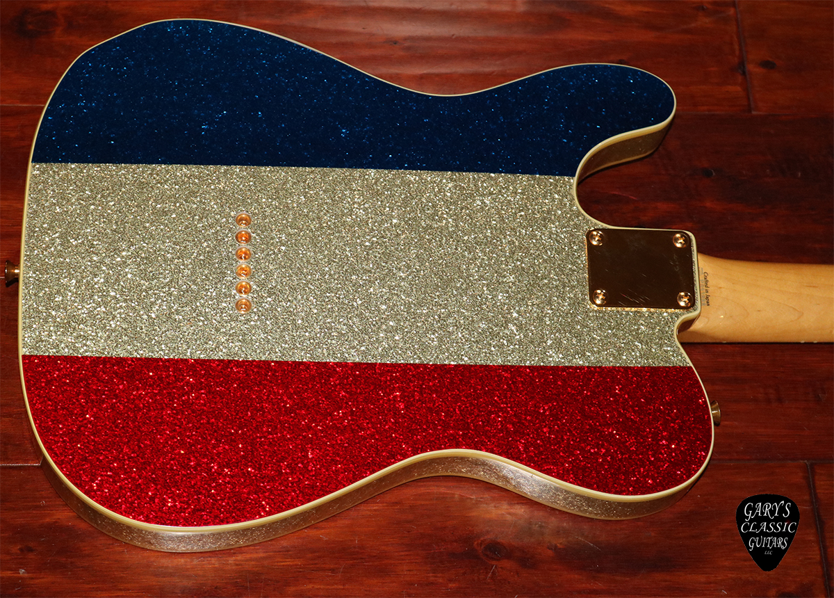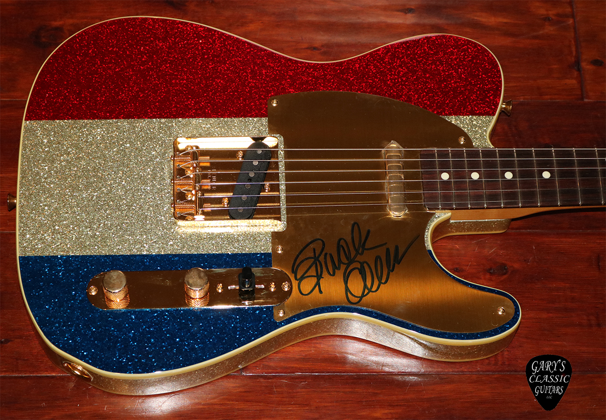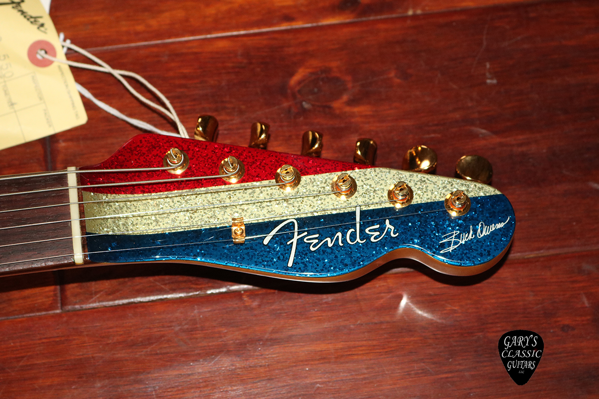 2002 Fender Buck Owens Telecaster, MIJ, Autographed, Sparkle Patriotic finish, Double bound body, Gold hardware & pickguard, Rosewood fingerboard, Gorgeous looking, Super clean with Original deluxe G&G hard case with case key and factory inspection tag, $3,995