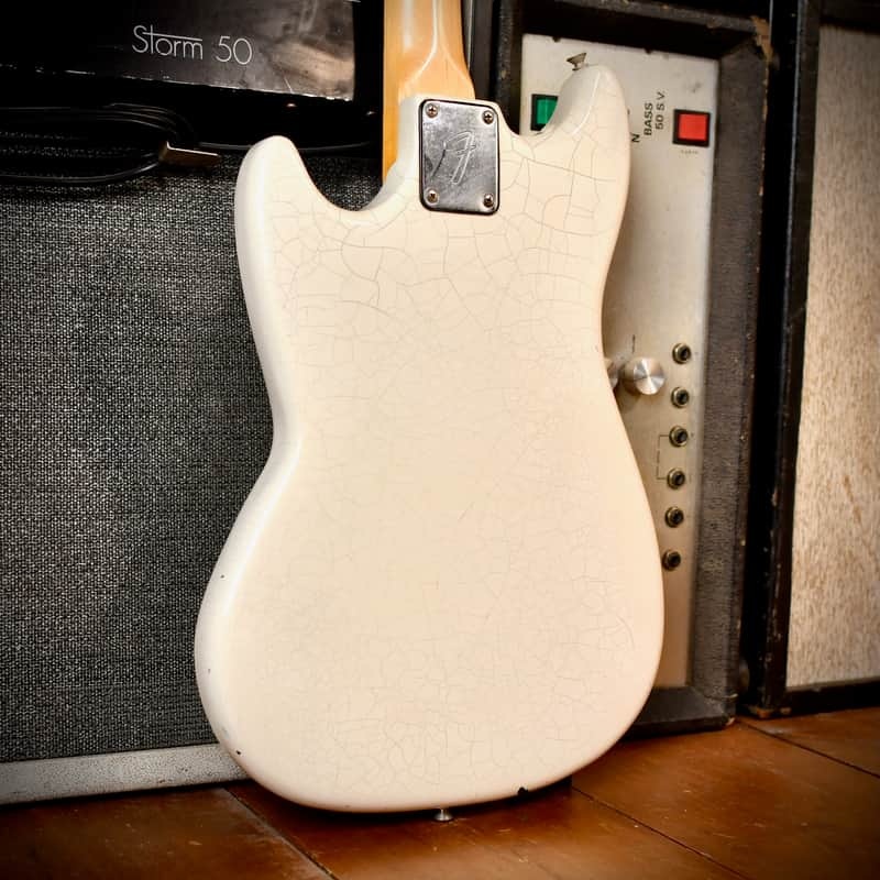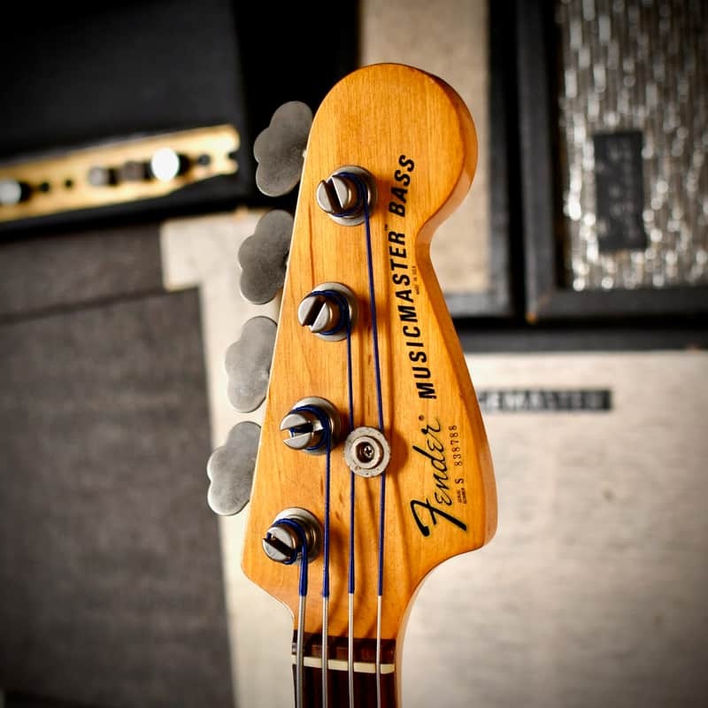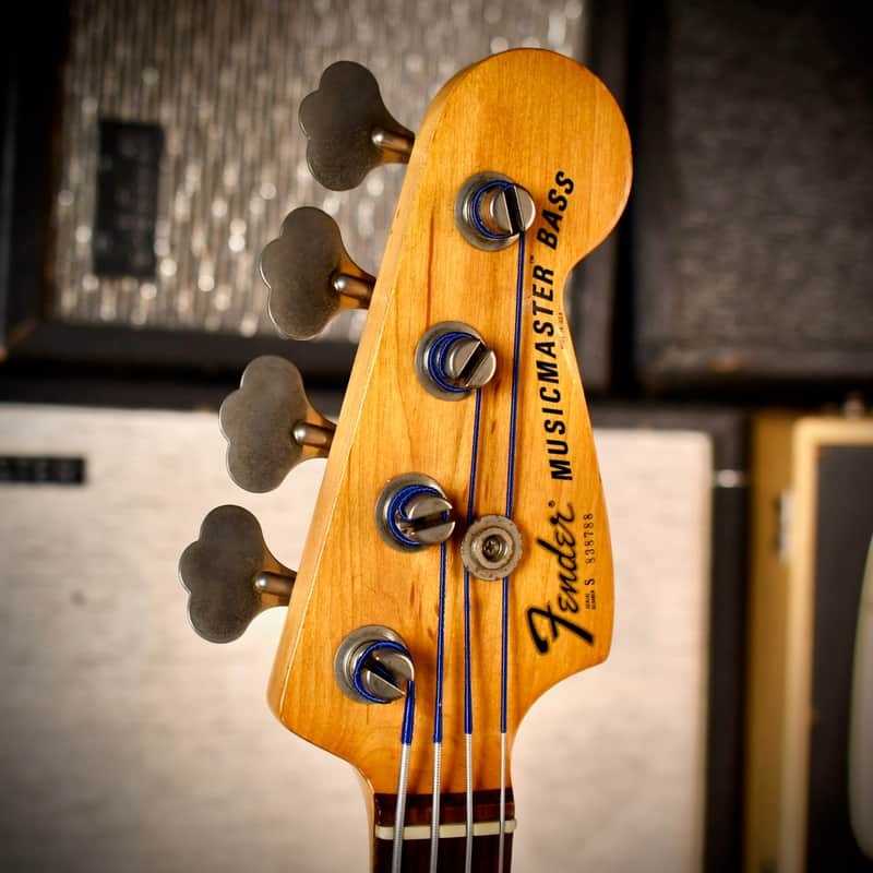 Fender introduced the Musicmaster Bass in the second half of 1970 as a companion to the Musicmaster guitar. It was designed as a budget-friendly, "student-model" alternative to the Mustang Bass. At its launch, it was Fender's lowest-priced bass, costing roughly $100 less than the Mustang. It was often sold as a set with the 12W Fender Musicmaster bass amplifier. The Musicmaster was largely assembled using surplus Mustang parts, though it lacked the Mustang’s "string-through-body" design and split-coil pickup. To keep costs low, Fender used a six-pole Stratocaster guitar pickup hidden under a solid plastic cover instead of a dedicated four-pole bass pickup, although this particular model was later equipped with a Jazz pickup. This bass is all original except for a body refin and the replaced pickup.