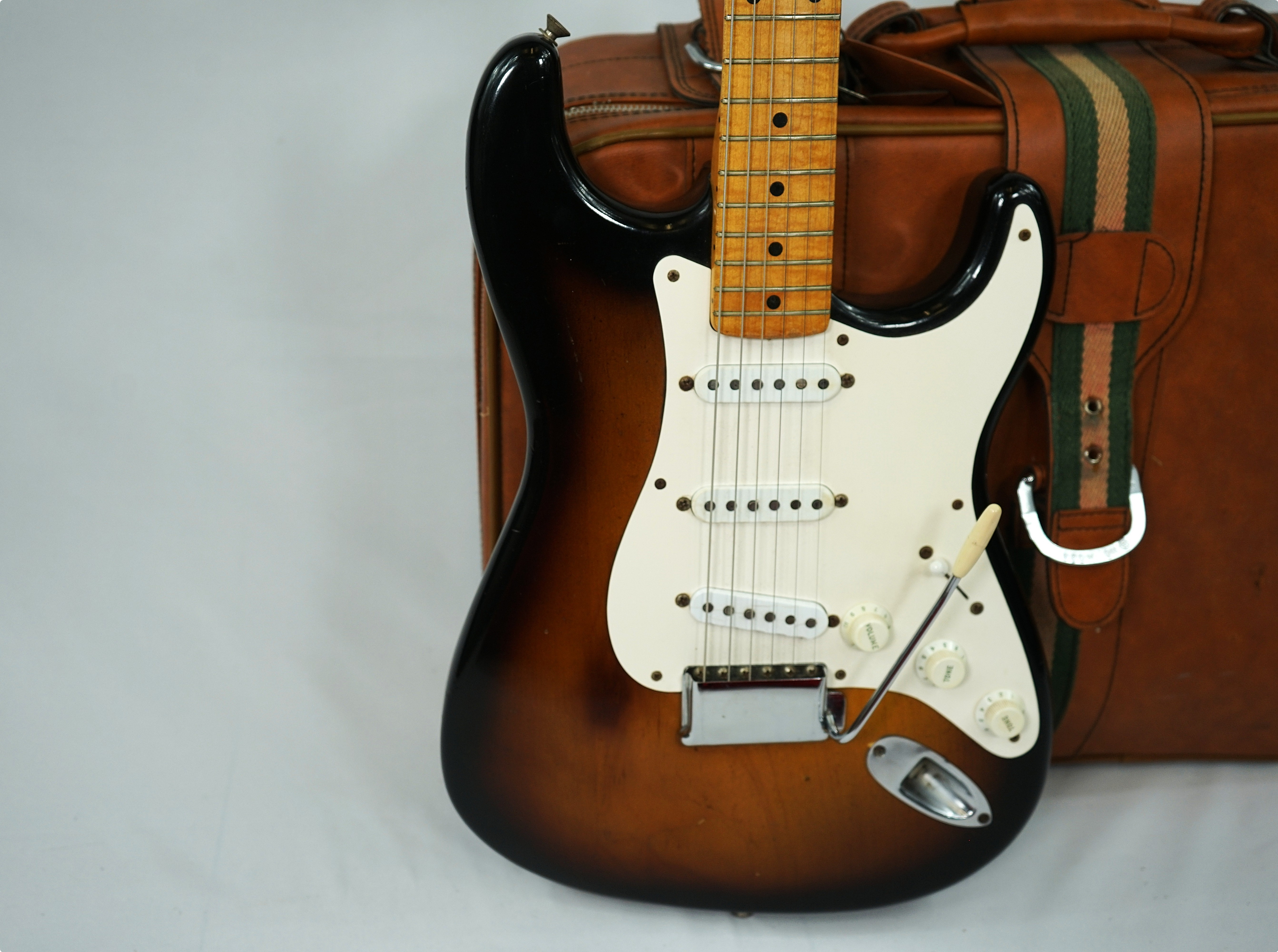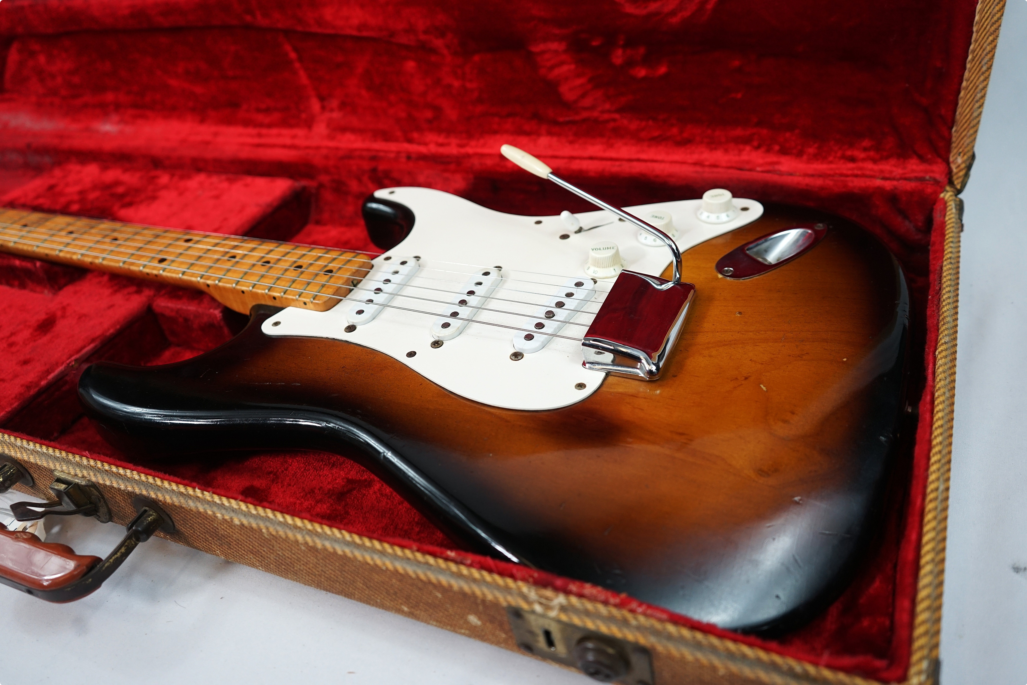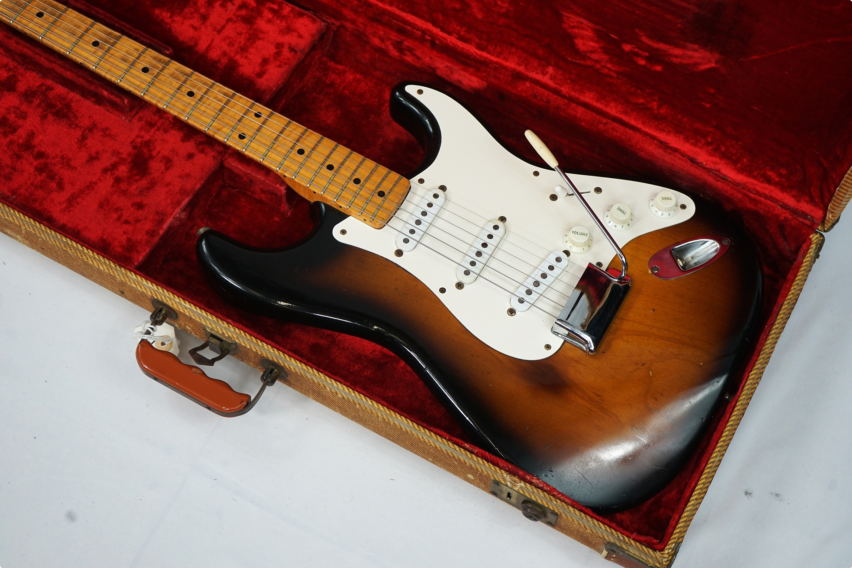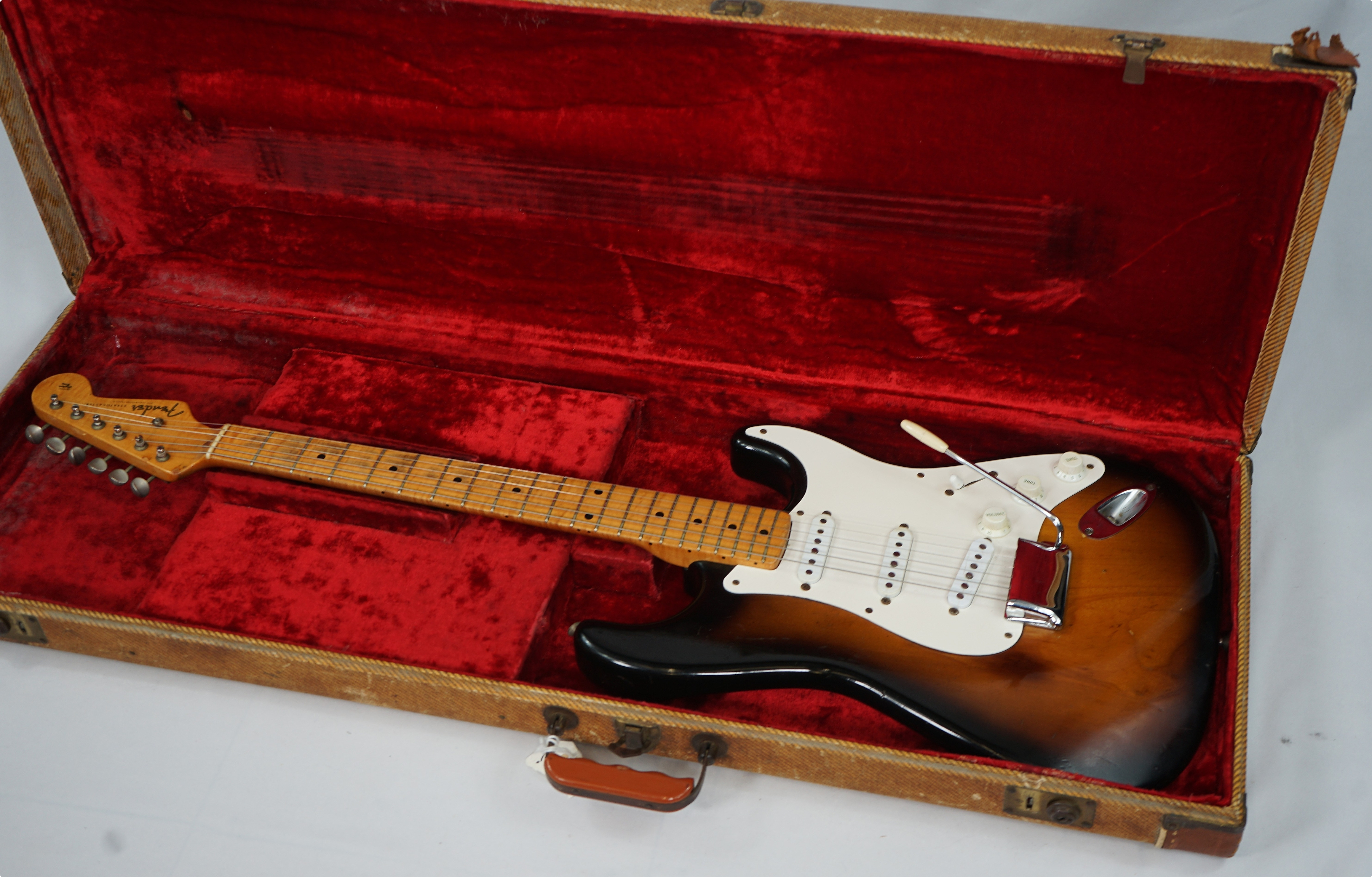 Here I have a stunning, first year of production, 1954 Fender Stratocaster, complete with its original tweed central compartment case, tremolo arm and bridge cover. If that isn't enough, this piece used to belong to Eric Johnson and comes with a photograph of Eric playing this distinctive Sunburst beast! With this one being 99.9% original, this is the holy grail for any Fender collector.