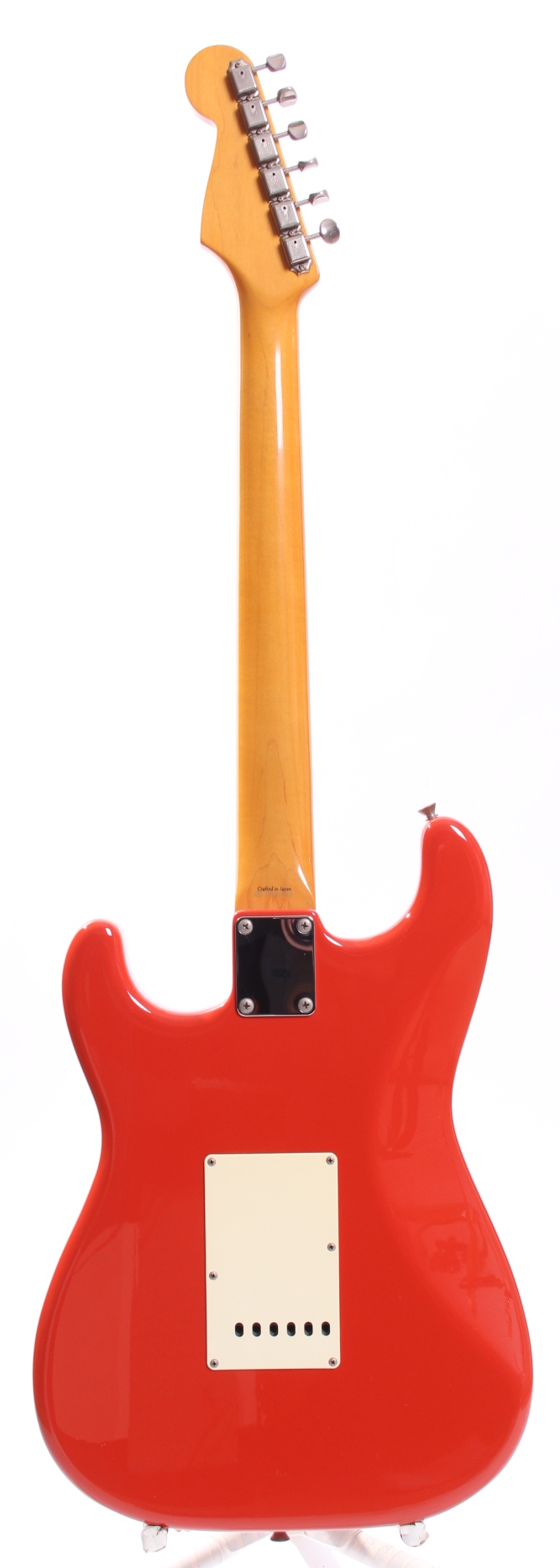 Ca. 2002 Fender Stratocaster '62 Reissue, fiesta red. Crafted in Japan, serial number P081429. This guitar is 100% original (except for a newer tremolo arm) and comes with factory mounted Fender USA Vintage pickups. Weighs 3.65kg.