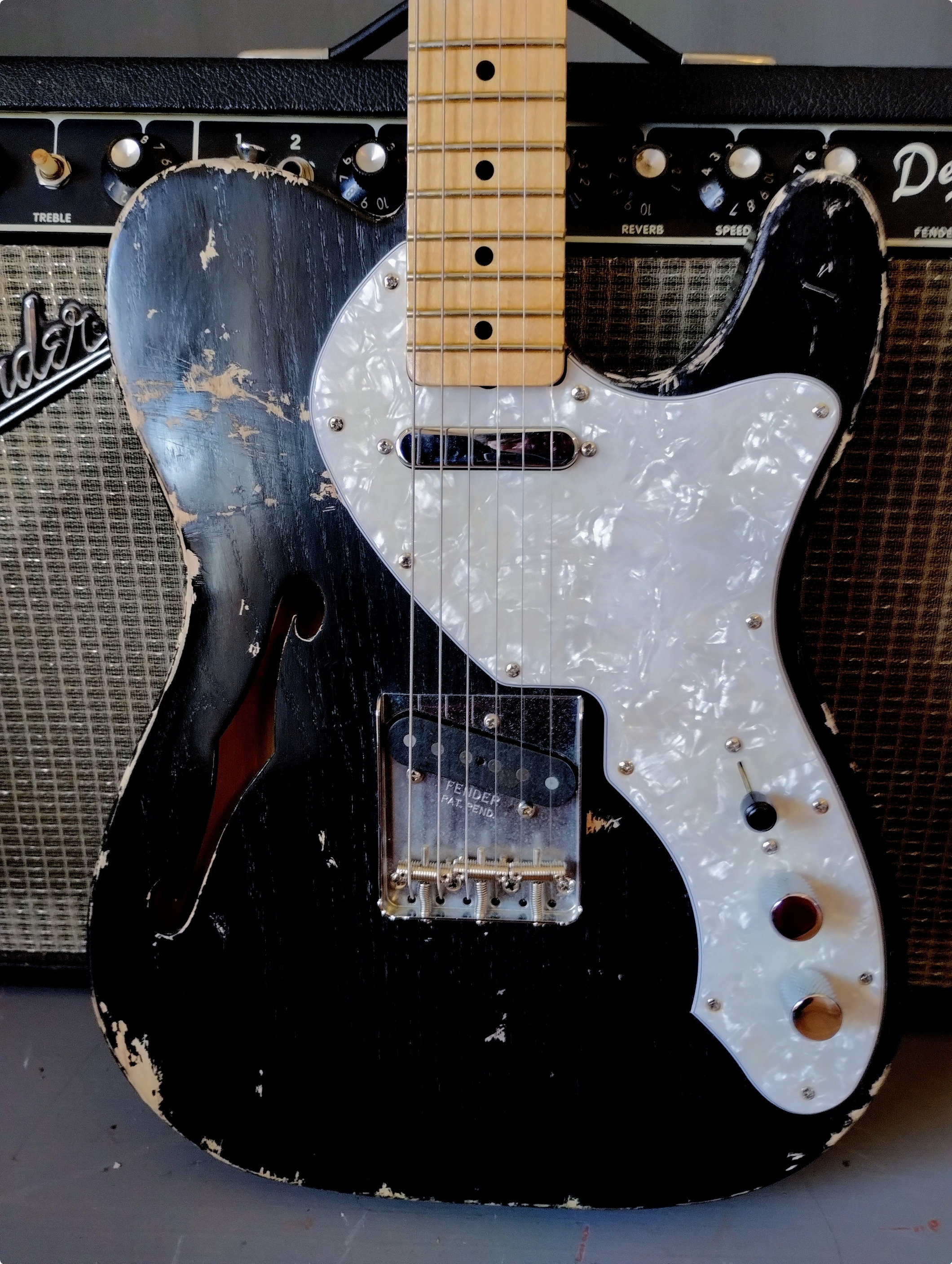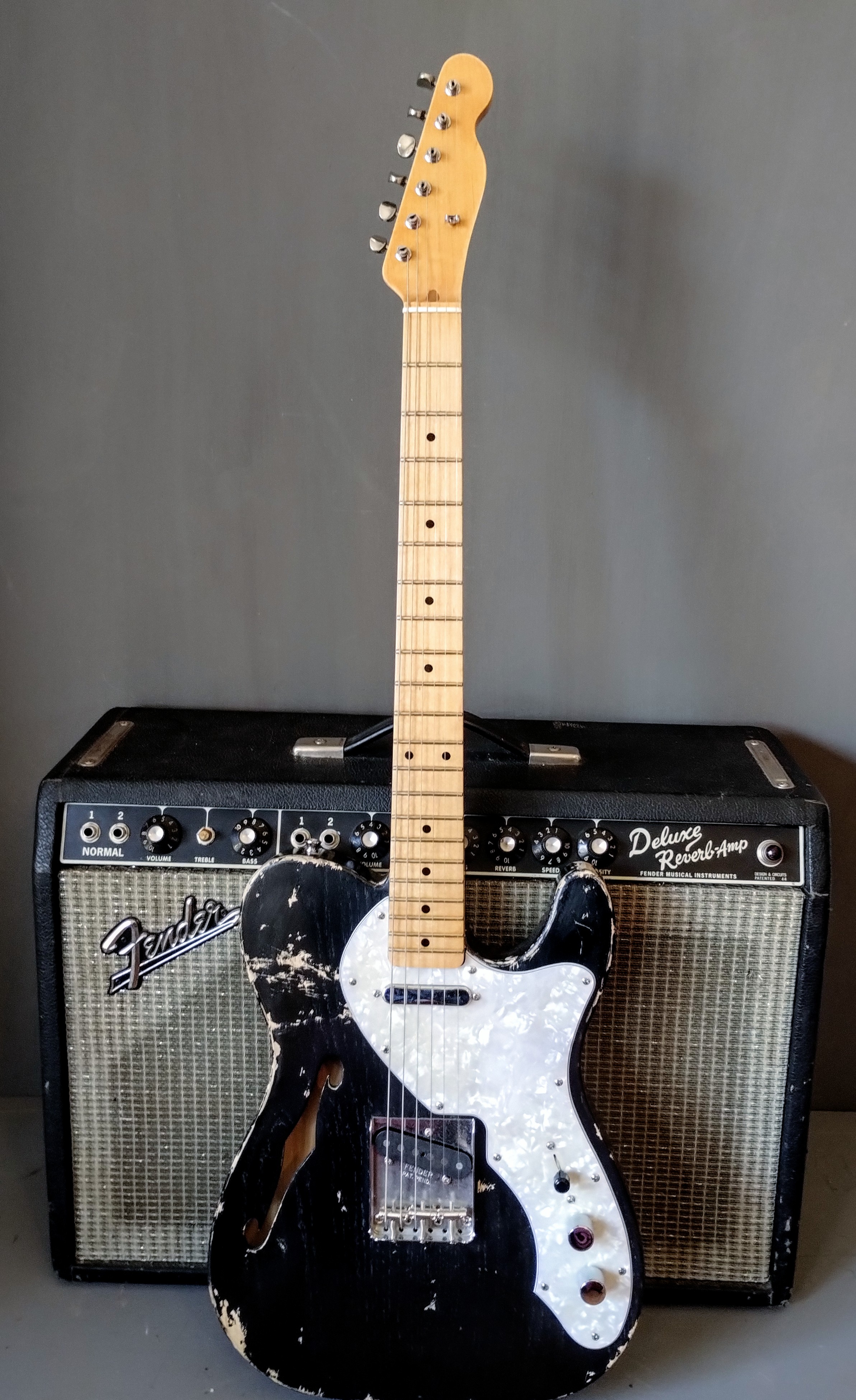 Custom Thinline Tele, heavy relic, Allparts Body und Neck, Fender Pure Vintage Pick Up's, nitro Laquer, aged, ca. 3,3 kg. Sehr schöne Thinline Tele, die Gitarre läßt sich hervorragend spielen und klingt fantastisch. Ich habe diese Gitarre, meiner 1969er thinline, nachgebaut.