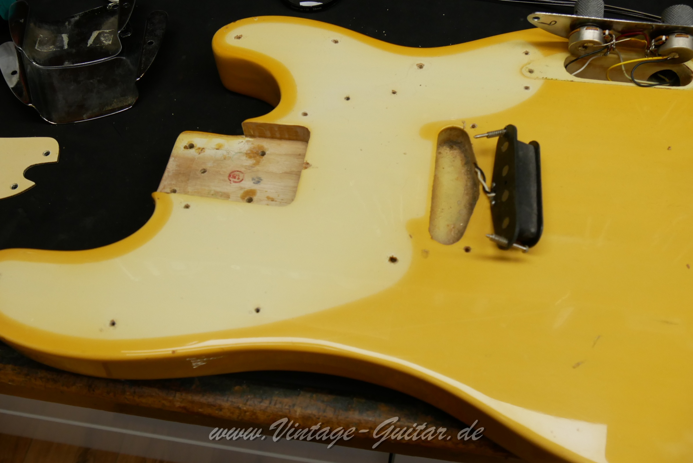 still w. single coil PU [classif. exc ] 60s style Tele bassAll original except prof. refretPots dated 66Pickup was changed to Seymore Duncan quarter-pound but comes w. intact original PU (can be reinstalled)Original pickguard w. perloid undersideComes w. new non-Fender tweed case