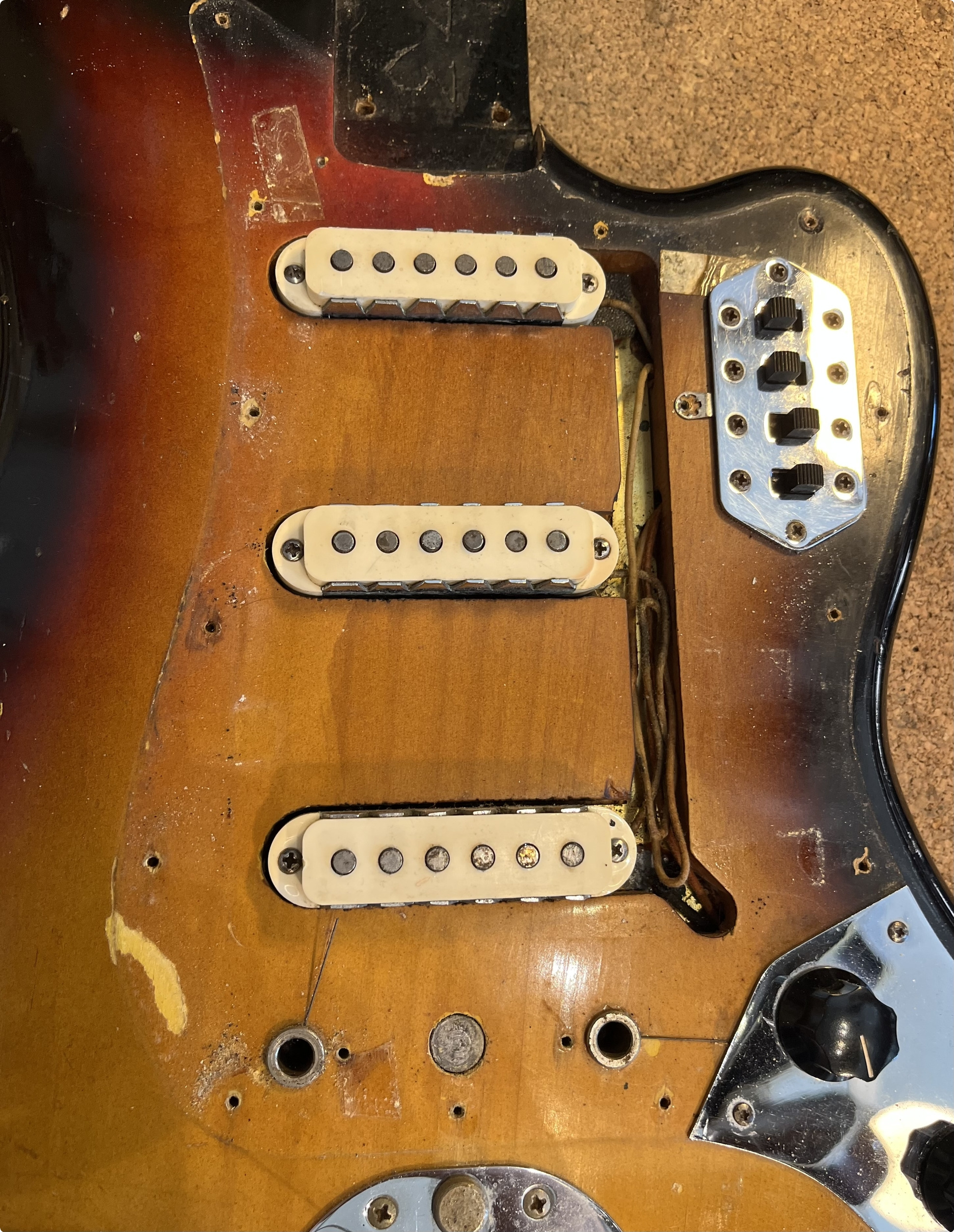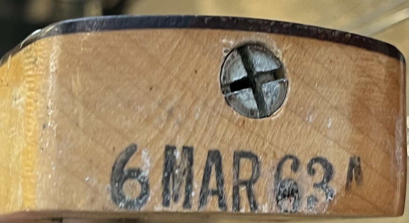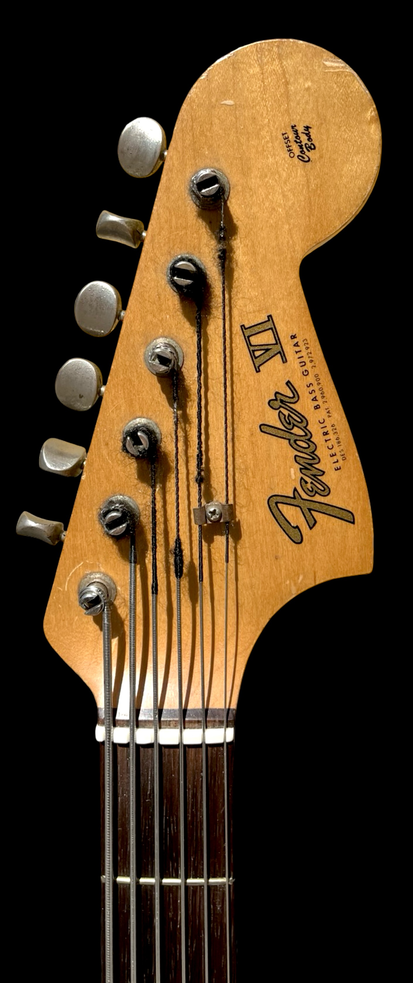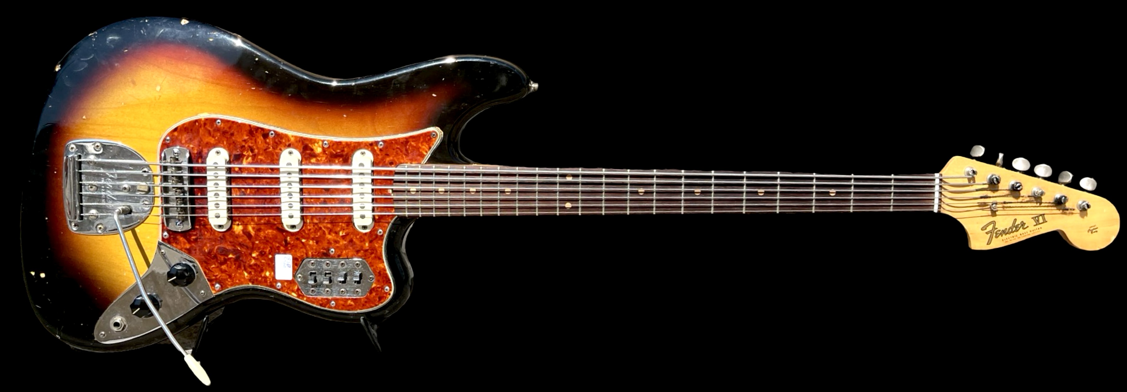 Rare 1963 Fender VI. Original electroics, tremolo, tuners, neck plate, pickguard and knobs. The red and the yellow in the sunburst is factory original but the black is an old pro overspray. You can see all of the original finish still bellow the black overspray.