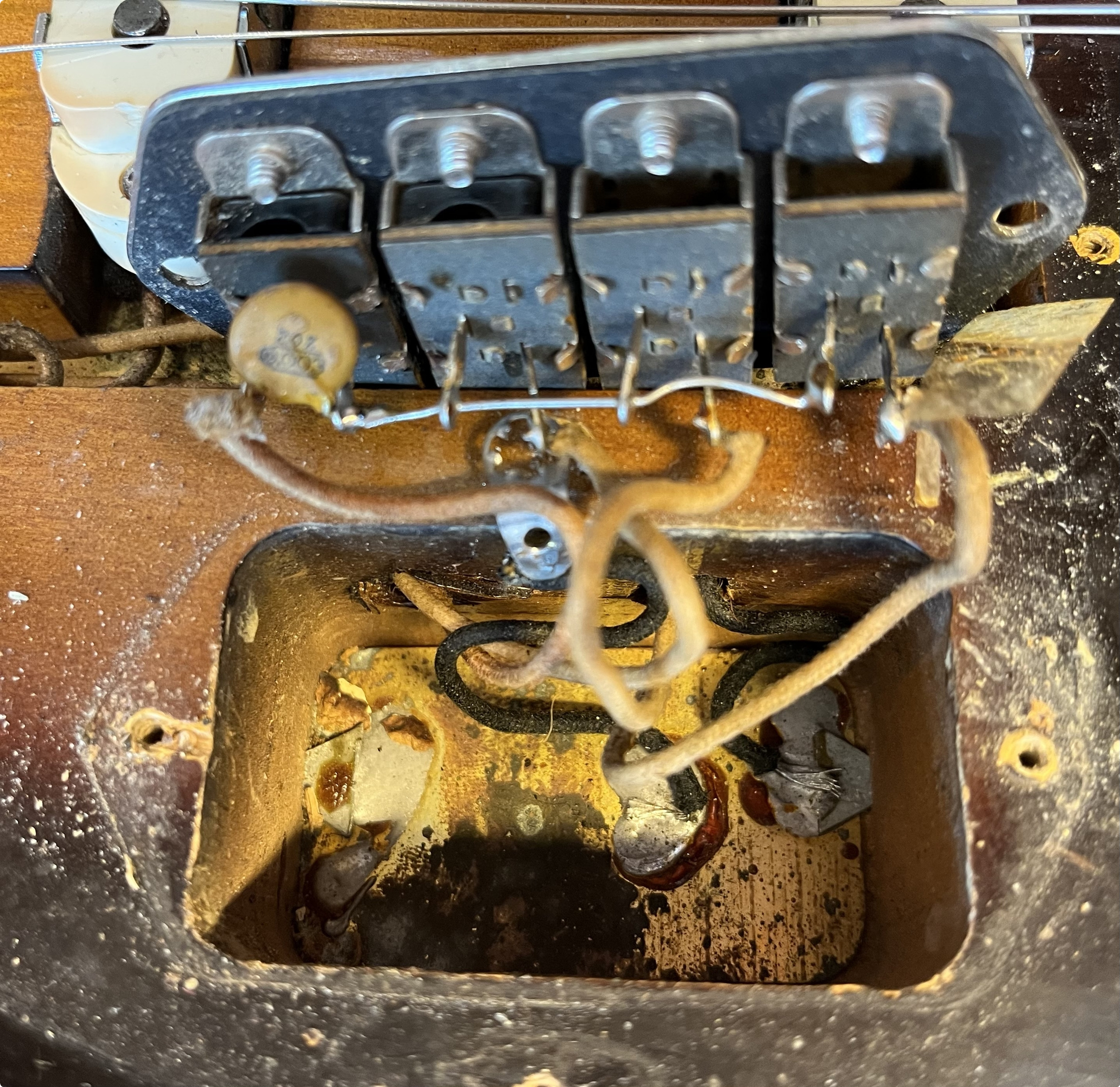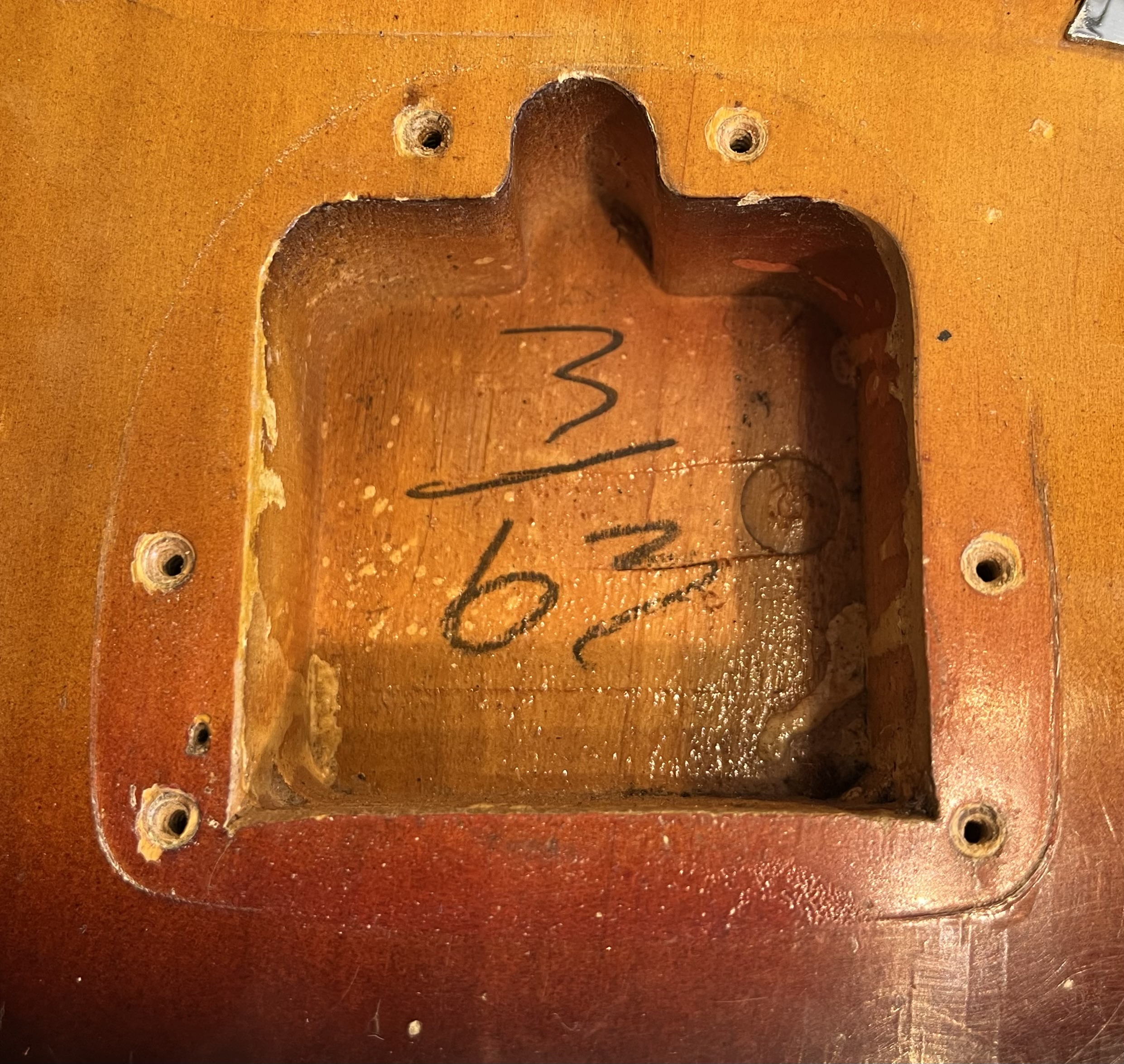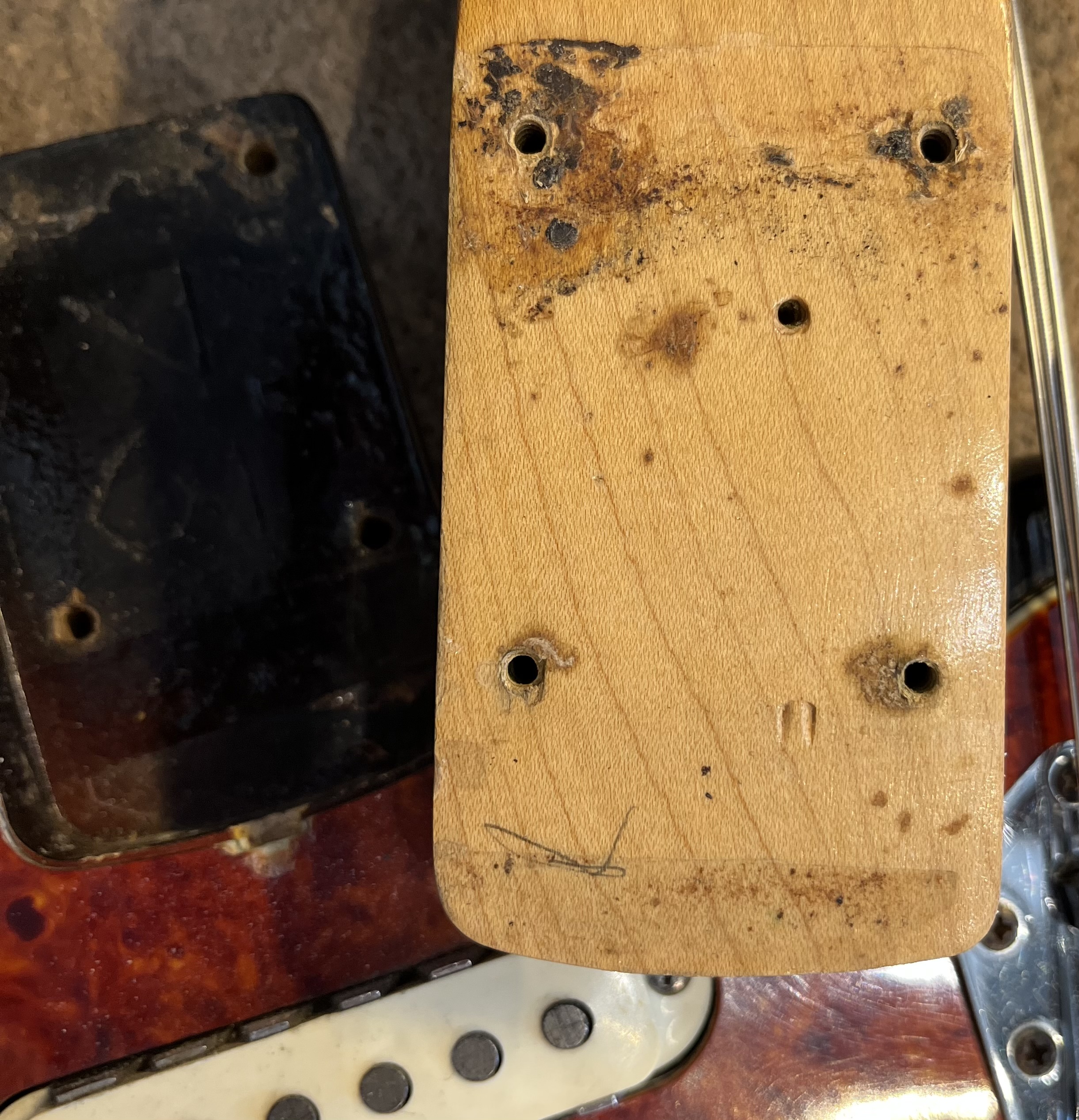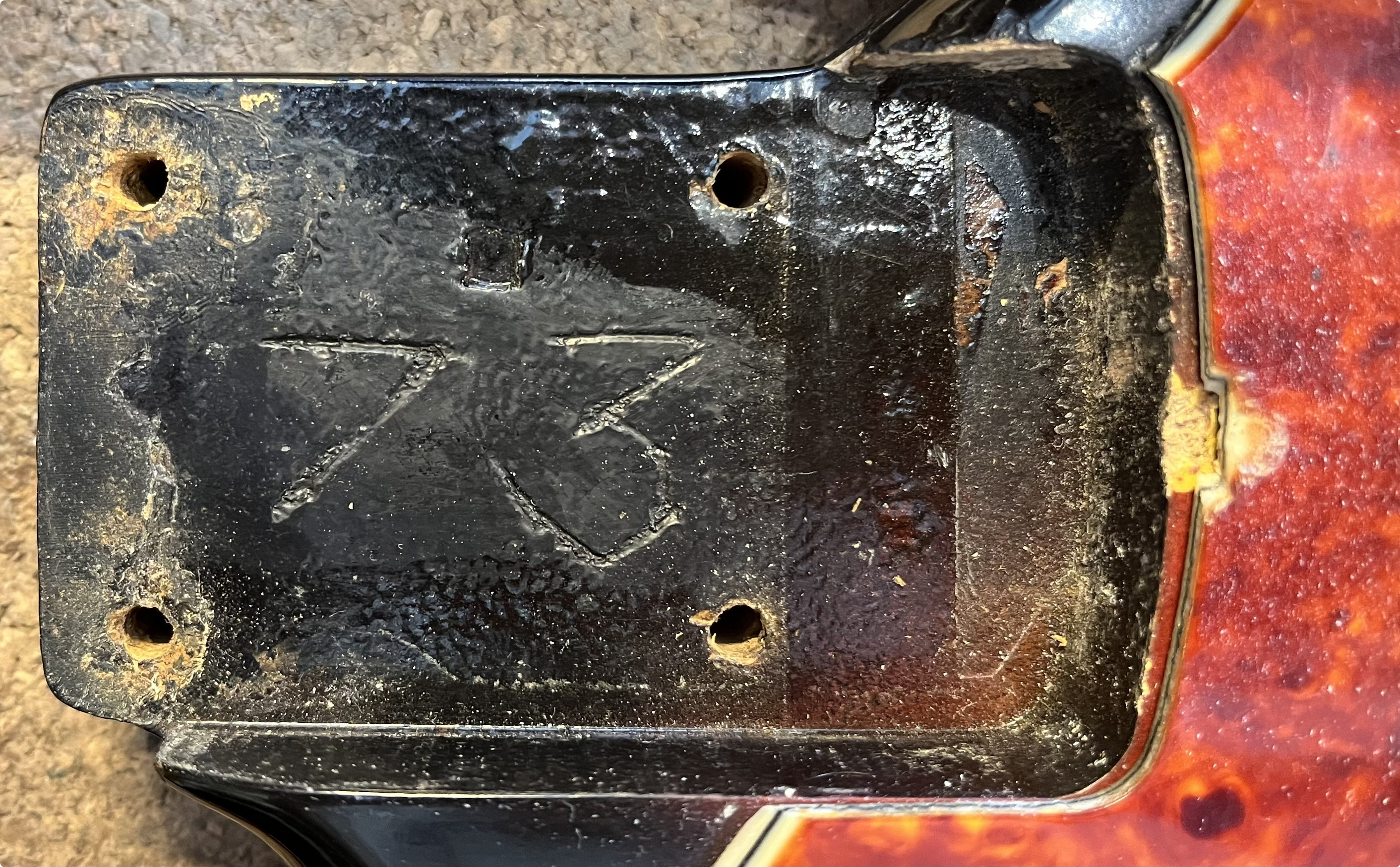 Rare 1963 Fender VI. Original electroics, tremolo, tuners, neck plate, pickguard and knobs. The red and the yellow in the sunburst is factory original but the black is an old pro overspray. You can see all of the original finish still bellow the black overspray.
