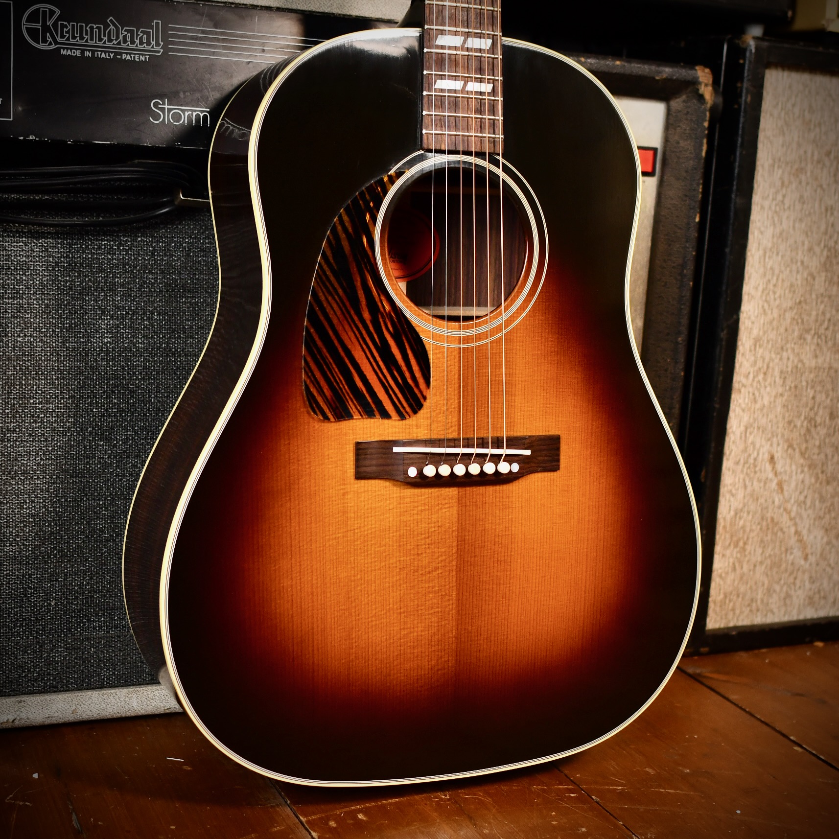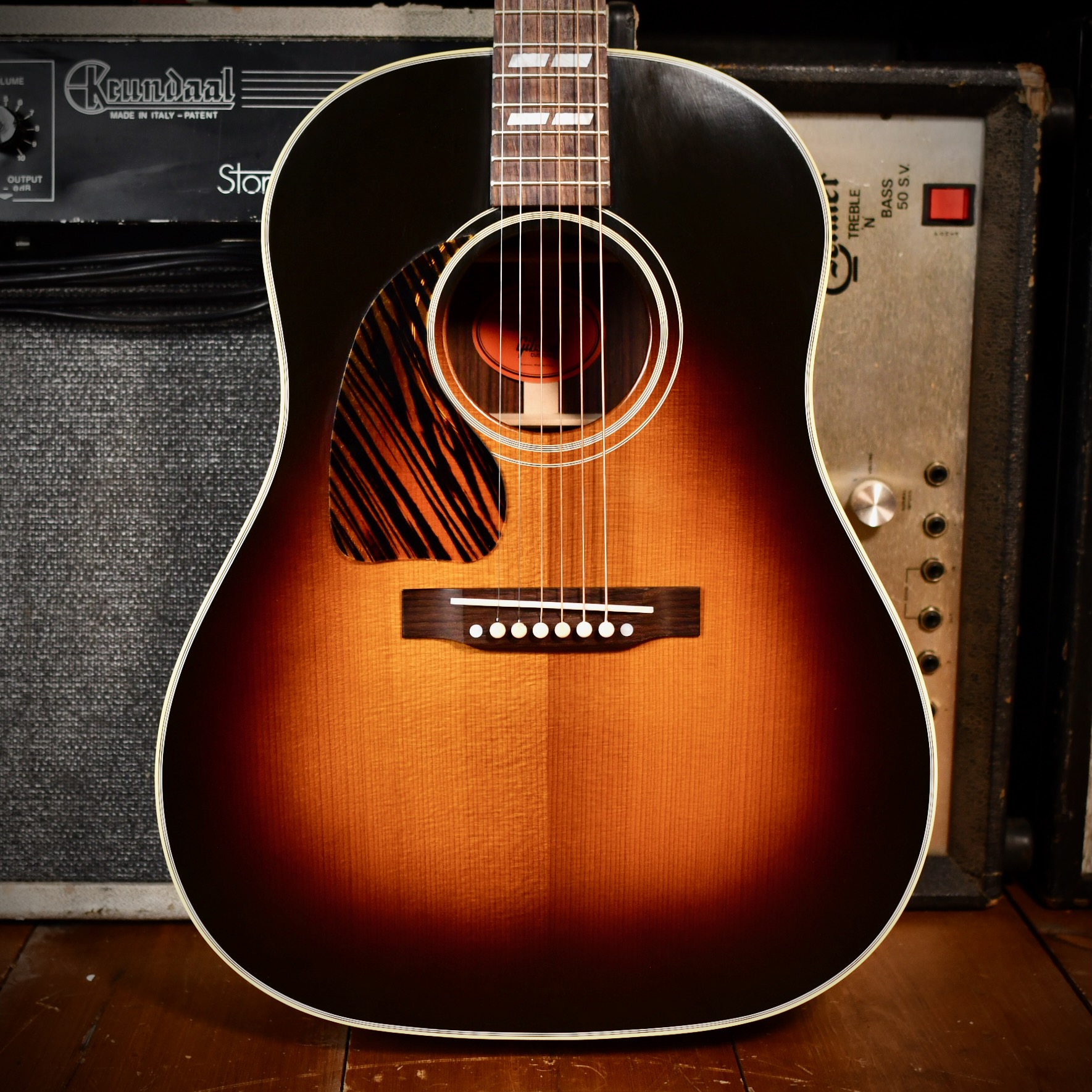 The Southern Jumbo (SJ) was originally introduced in 1942 as a more "deluxe" version of the popular but plain J-45 model. This "Banner" reissue specifically pays tribute to the World War II era (1942–1945), distinguished by the golden banner on the headstock that famously states: "Only a Gibson is Good Enough”. The top is made of Adirondack Red Spruce that has been "baked" (torrefied) to mimic the cellular structure and dried-out response of a 1940s vintage instrument. To maintain historical accuracy, Gibson also uses hot hide glue for the top bracing and neck joint, which provides a more efficient energy transfer than modern synthetic glues. The "Demo" engraving on the back of the headstock means the guitar was destined for artist demonstration / promotional purposes.