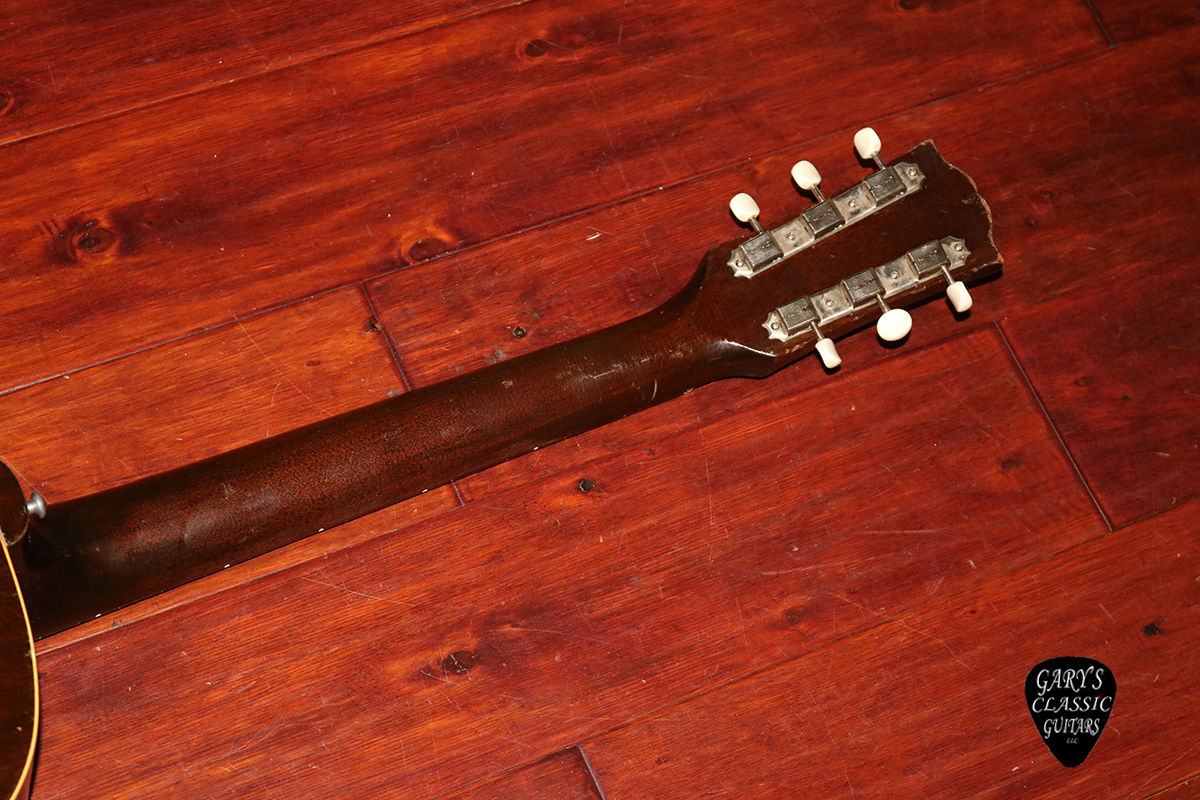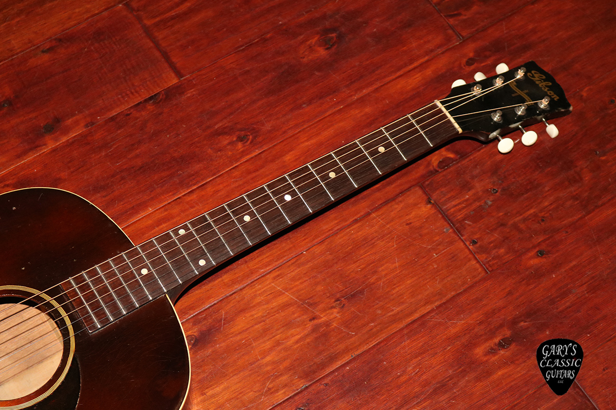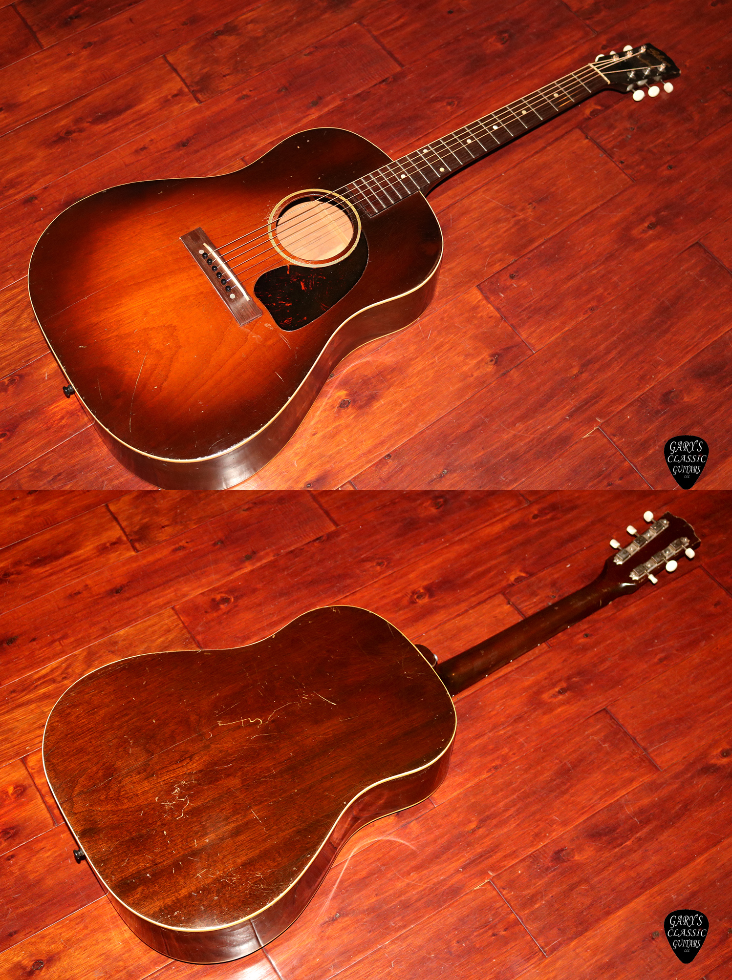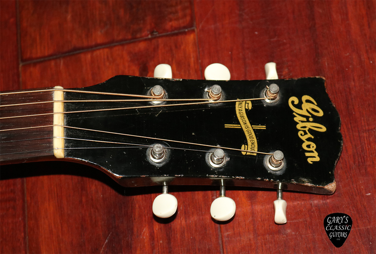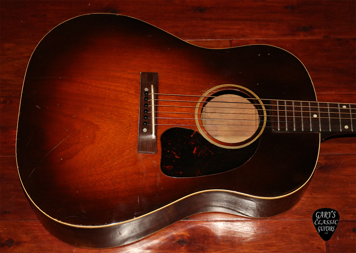 1942 Gibson Banner J-45, Banner logo “only a Gibson is Good Enough”, Tobacco Sunburst finish, Mahogany top, back & sides, Plays great with a recent pro neck reset, Tuners are replaced with a vintage set of sealed Klusons, Professionally repaired hairlines on body, Full feeling neck, Sounds Warm Resonant, Woody & Rich, Sought after model, Newer hard case.