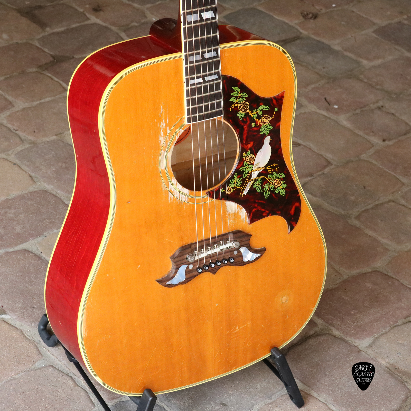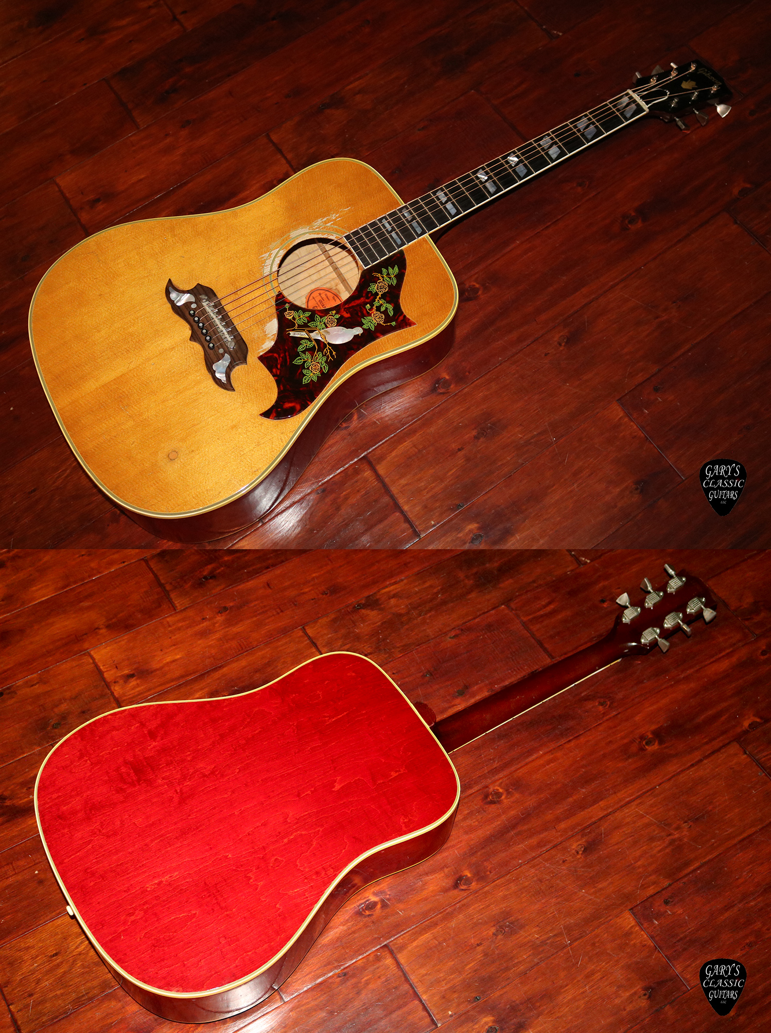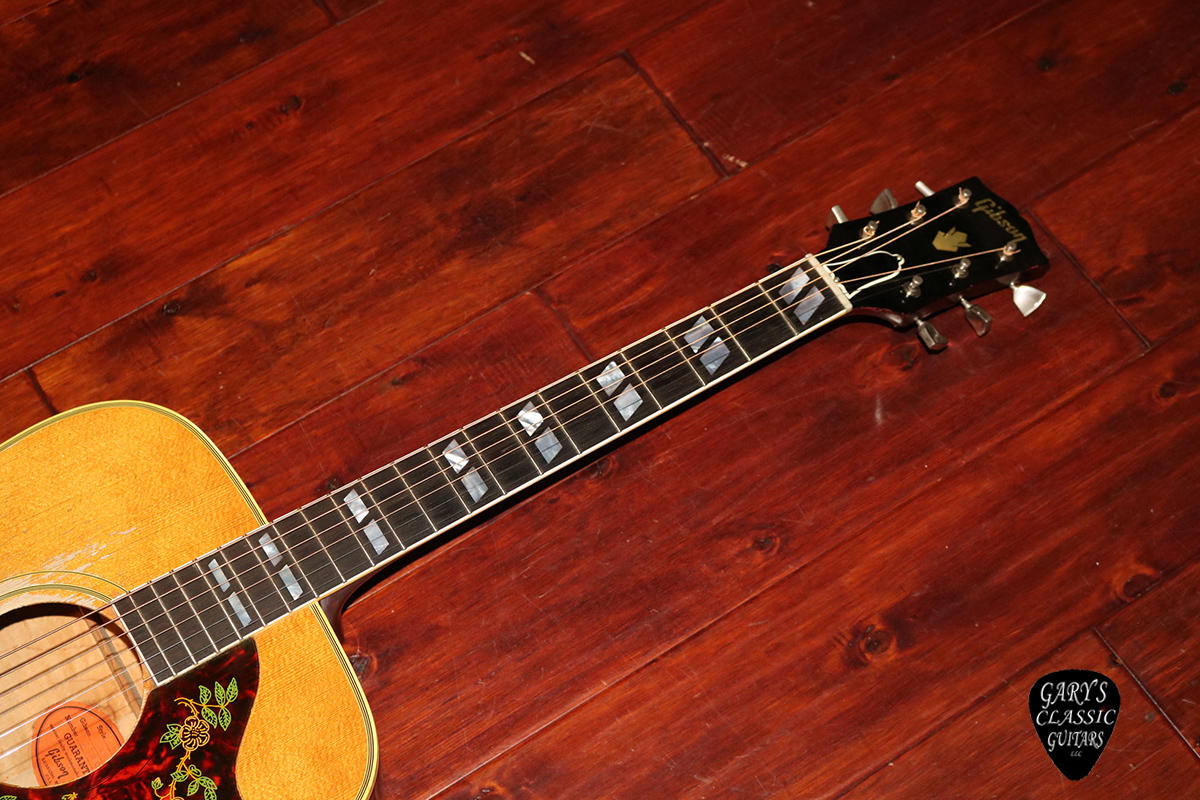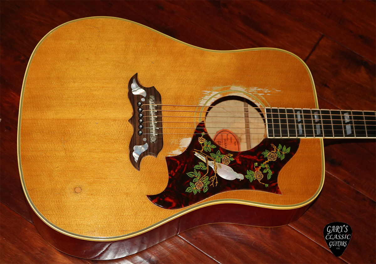 1963 Gibson Dove, First year for a natural finish, Ornate Dove pickguard in excellent condition, Great sounding guitar with nice smooth low action, 1 & 11/16 inches wide at the nut, Deluxe Tune-o-Matic adjustable bridge, Strap button fill by endpin and heel, Removed volume knob on top now filled, Great pro refret, Amazing player! Hard to find guitar, VG++, 60’s Gibson hard case, $9,995