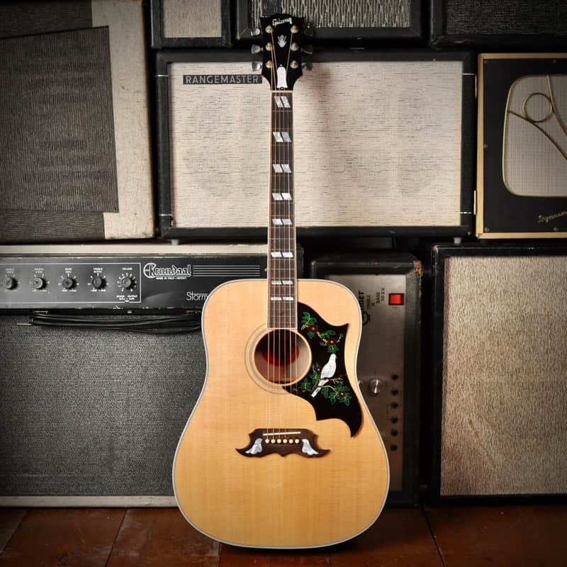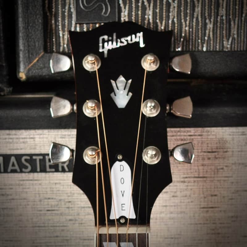 The Gibson Dove was introduced in 1962, following the success of the Gibson Hummingbird, as a square-shouldered acoustic dreadnought guitar known for its distinctive bright and powerful tone derived from its solid Sitka spruce top and maple back and sides. Distinguished by its ornate aesthetic features, including a large engraved pickguard with a dove motif, mother-of-pearl parallelogram fingerboard inlays, and dove inlays on the "mustache" bridge, the Dove quickly became an iconic instrument. Early models featured a controversial adjustable metal bridge that was later replaced with a traditional fixed bridge in the late 1960s to improve tone. Since 1992, the Dove has been built in the Gibson acoustic factory in Bozeman, Montana, where modern production adheres to classic designs, maintaining its legacy as a favorite among musicians such as Elvis Presley and Tom Petty.