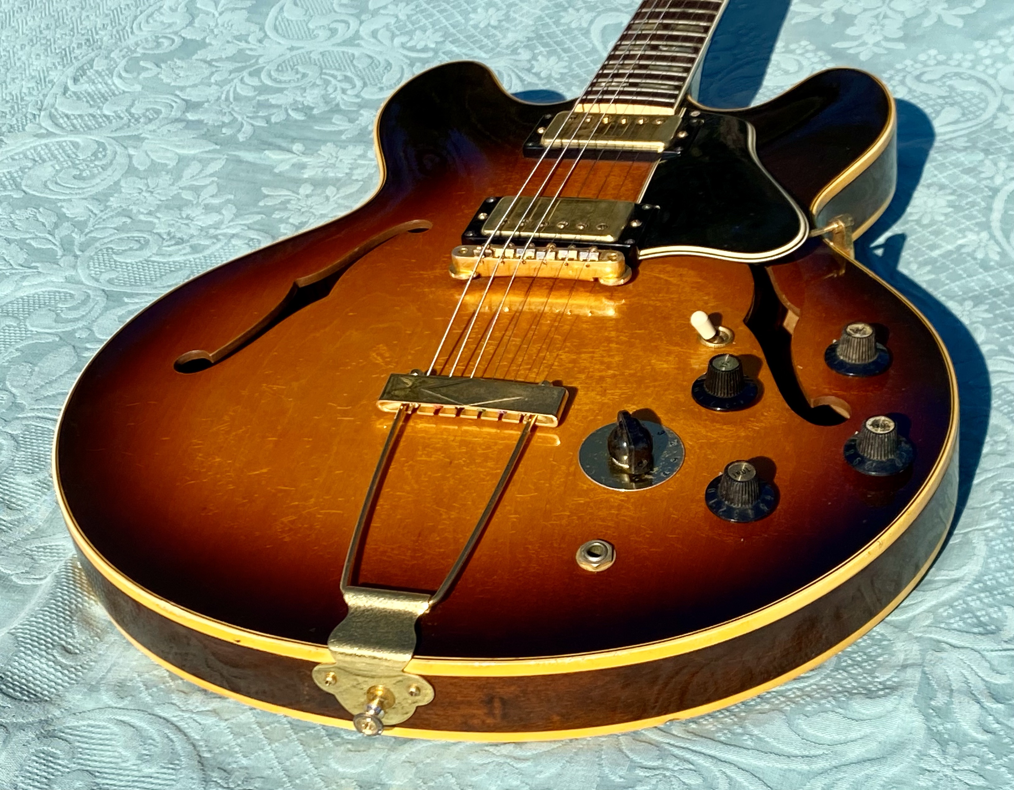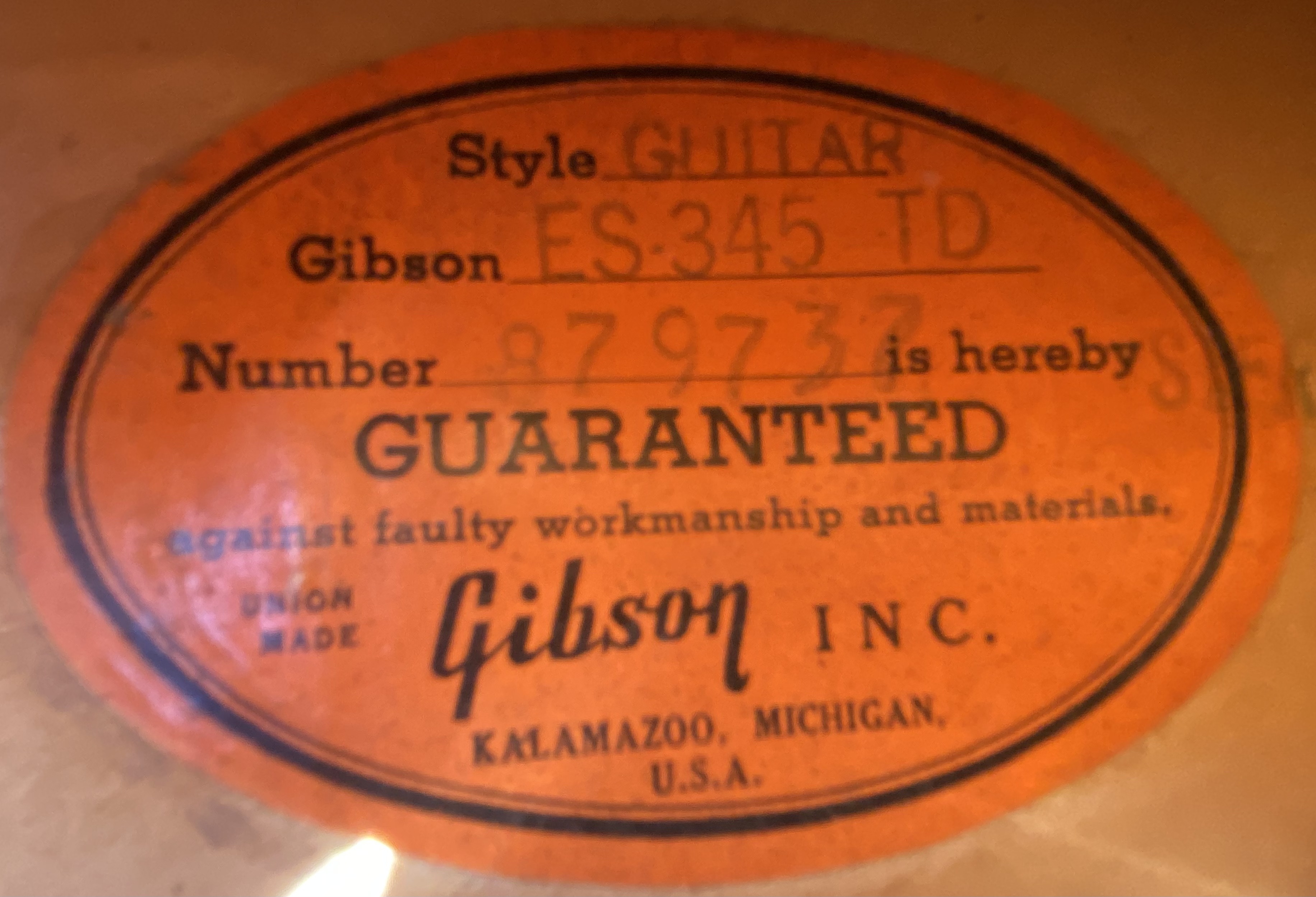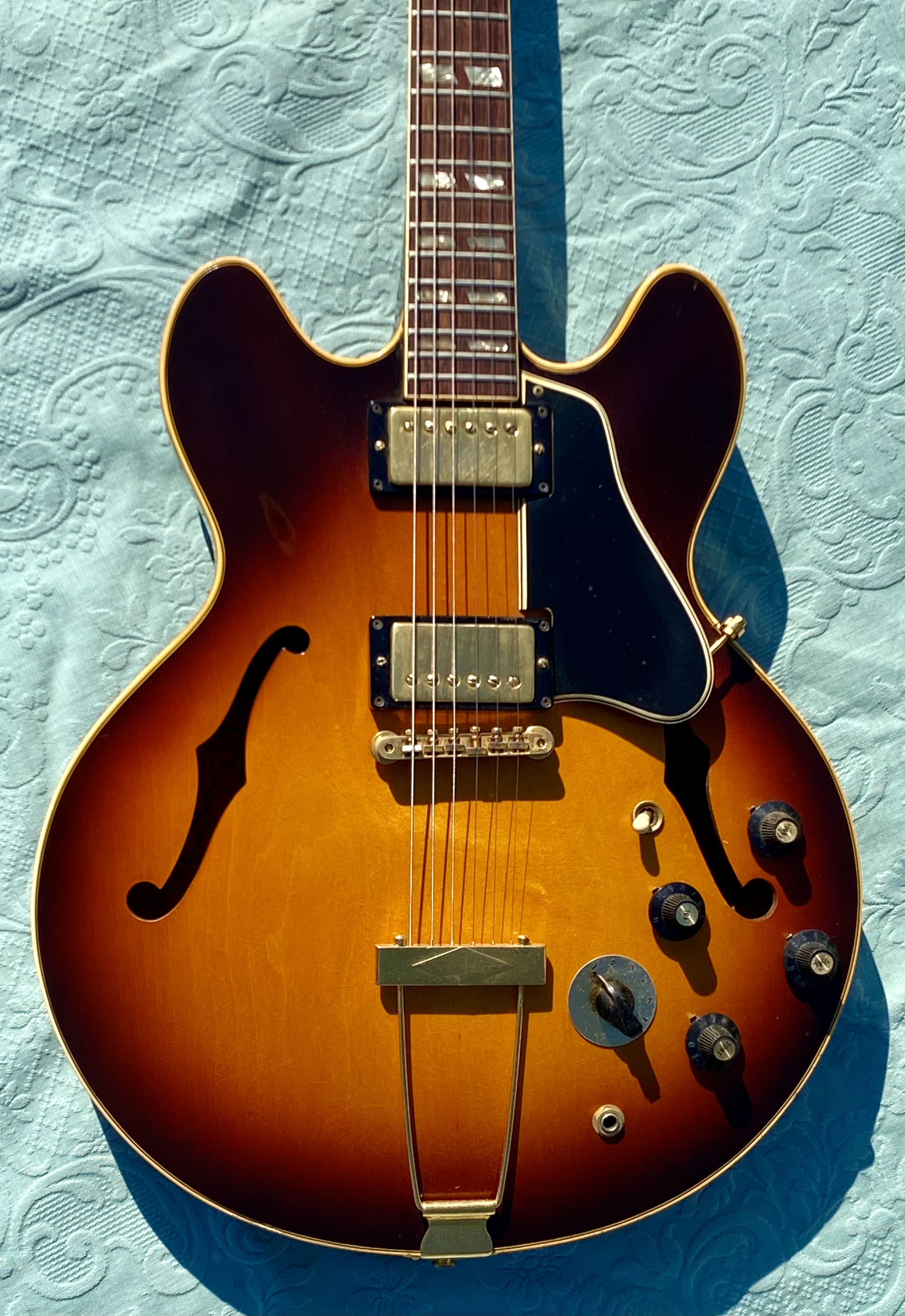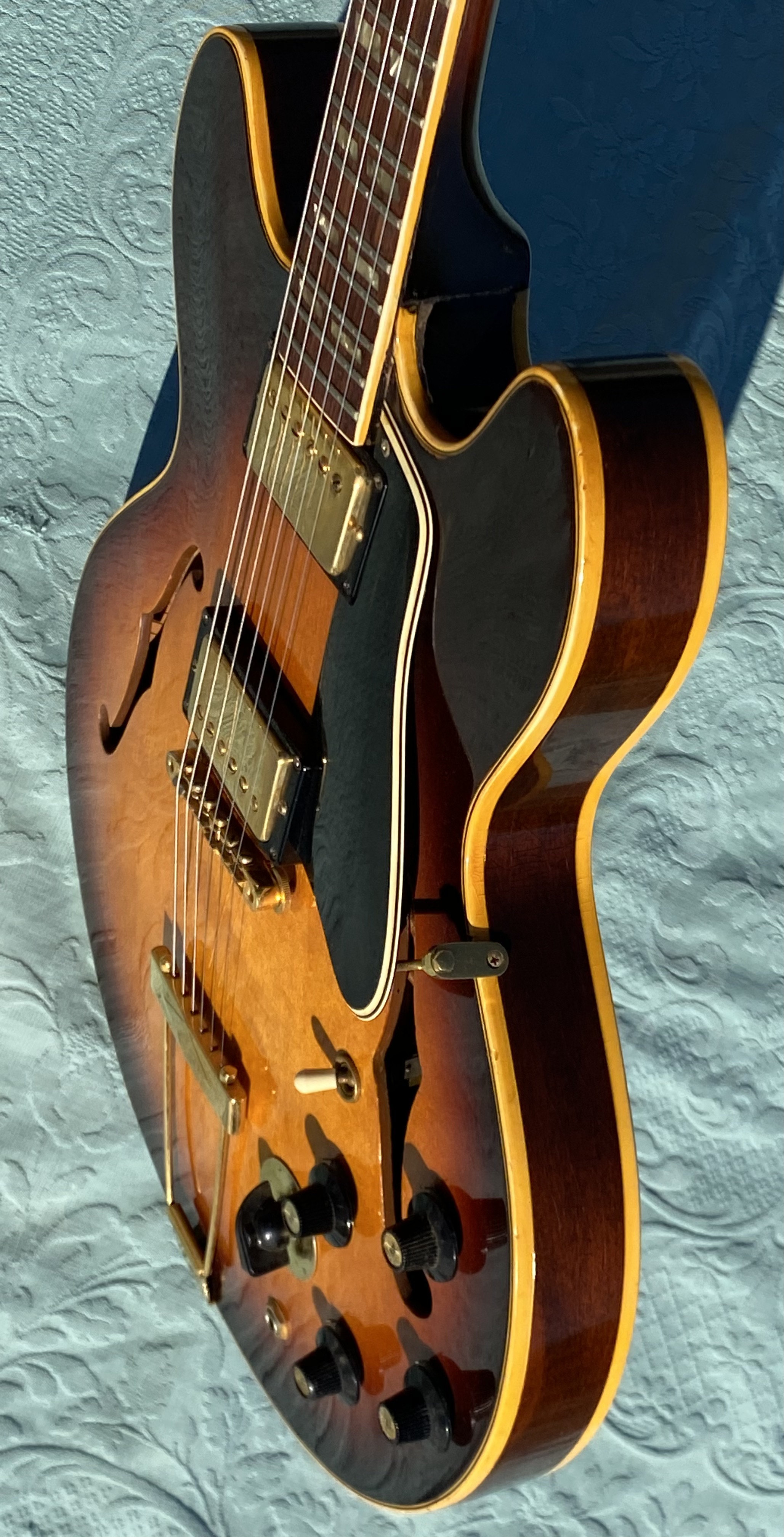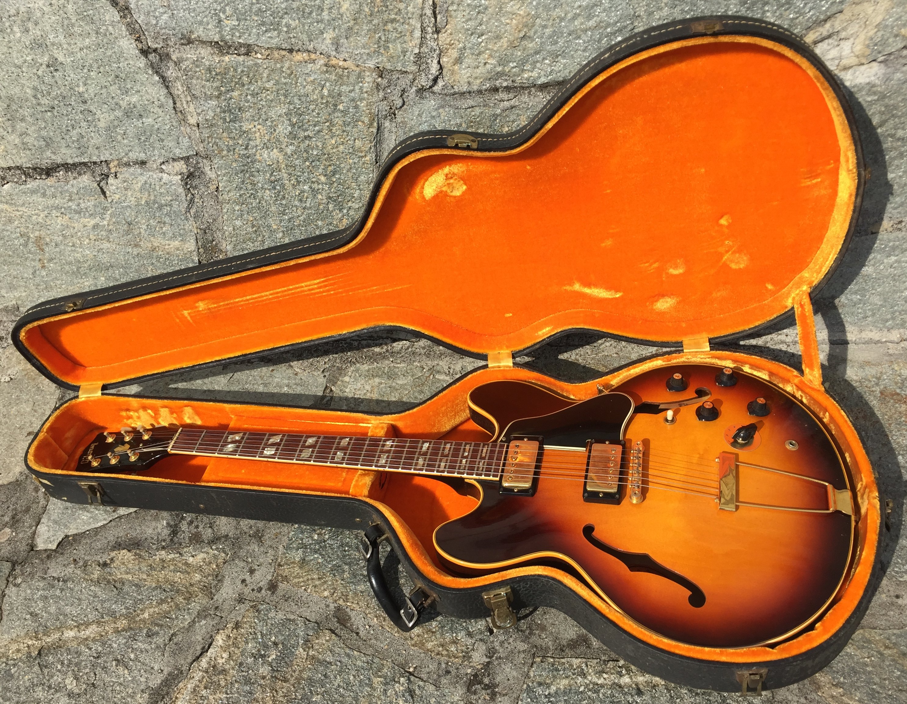 1967 ES-345 TD Stereo, Sunburst, vari-tone, only 501 made, Very nice conditions, fast neck with very good frets (prof refretted) and low actions. Orig. Kluson Deluxe tuners. All Original also thePatentsticker pickups. No breakage, some little ding&dong. Checking in original finish as normal. Orig. Pat. Number Bridge and Tailpiece. Come with Original Hard Case Yellow interior. Strong SoundSUPER ! code GI3333