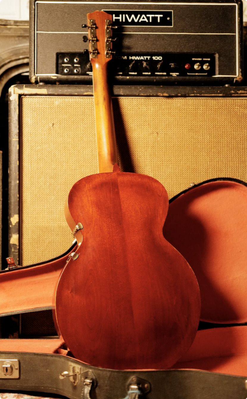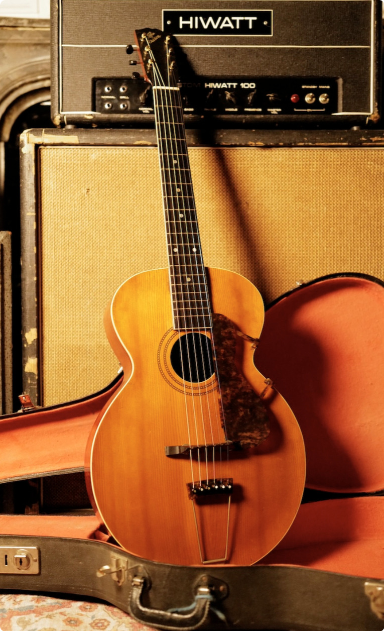 Built with a carved spruce top and featuring the distinctive combination of archtop construction with a round soundhole, this model captures a transitional moment in Gibson’s design history. The result is a tone that is dry, punchy, and woody, with a natural compression well suited to early blues and ragtime styles.