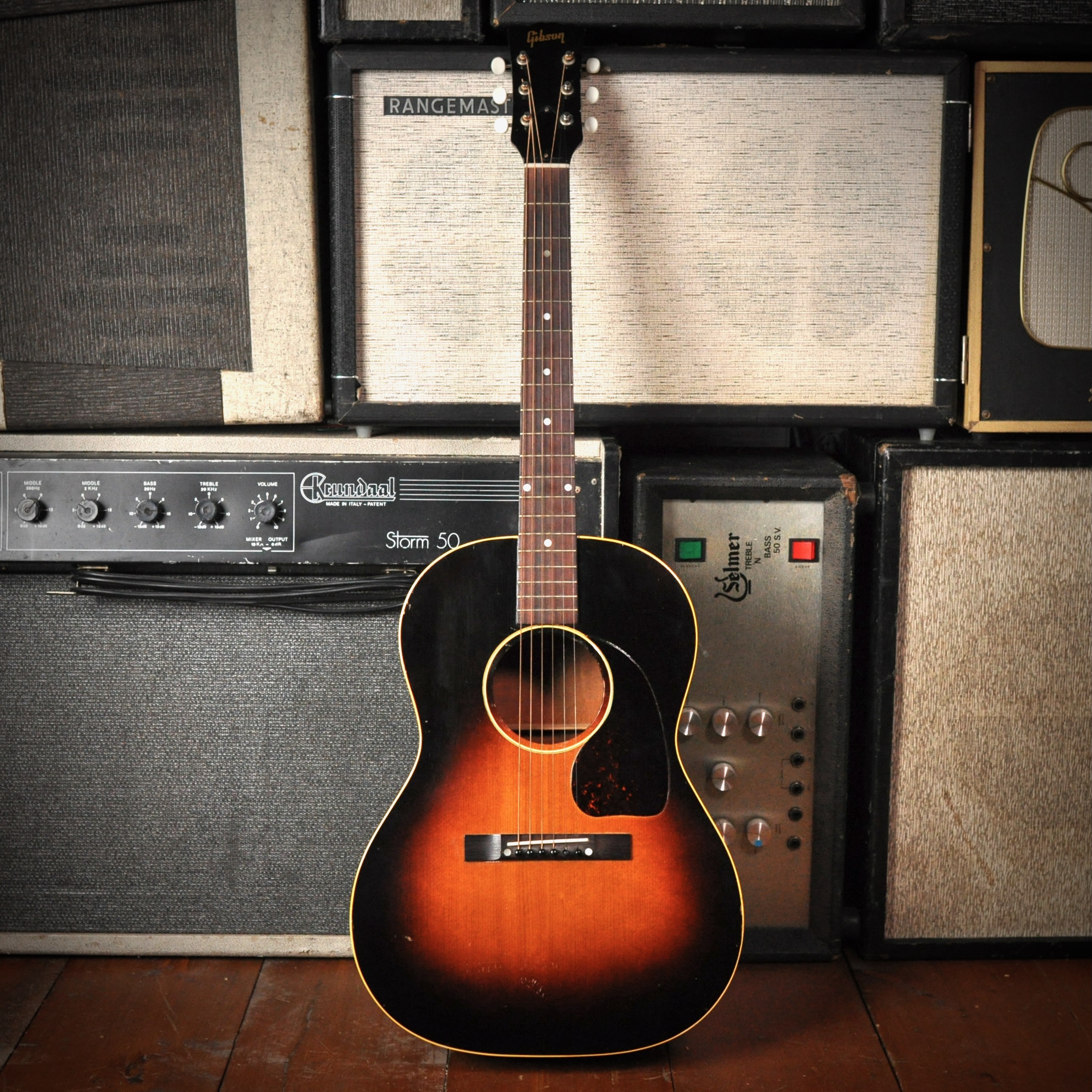 This Gibson LG-1 from 1954 is a small-bodied, ladder-braced acoustic guitar produced in Kalamazoo, Michigan. Positioned as an entry-level or "student" model, it is prized today for its distinctive woody, boxy, and warm bluesy tone, contrasting with the richer, more complex sound of its X-braced siblings (LG-2 and LG-3). The LG series was introduced in 1942 as a line of small-body flat-top guitars. The LG-1, LG-2, and LG-3 were initially all X-braced. However, after production was suspended during World War II, the LG-1 was reintroduced with more economical ladder bracing and a sunburst finish, which became its defining characteristic after the war. Throughout the 1950s and 60s, the LG-1 remained a popular seller, known for its value and quality materials at a low price point. The LG-1 was featured prominently in several Elvis Presley films in the 1960s as a prop guitar.