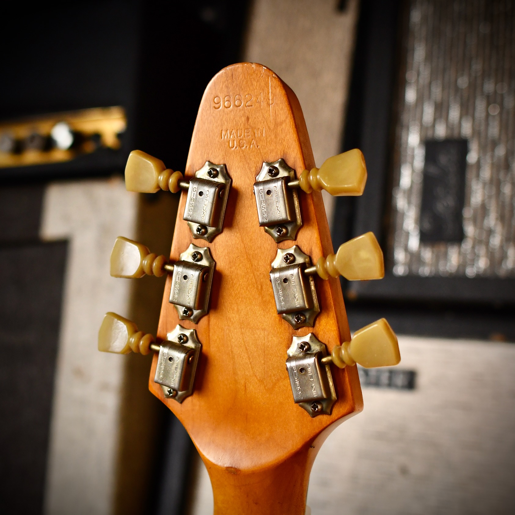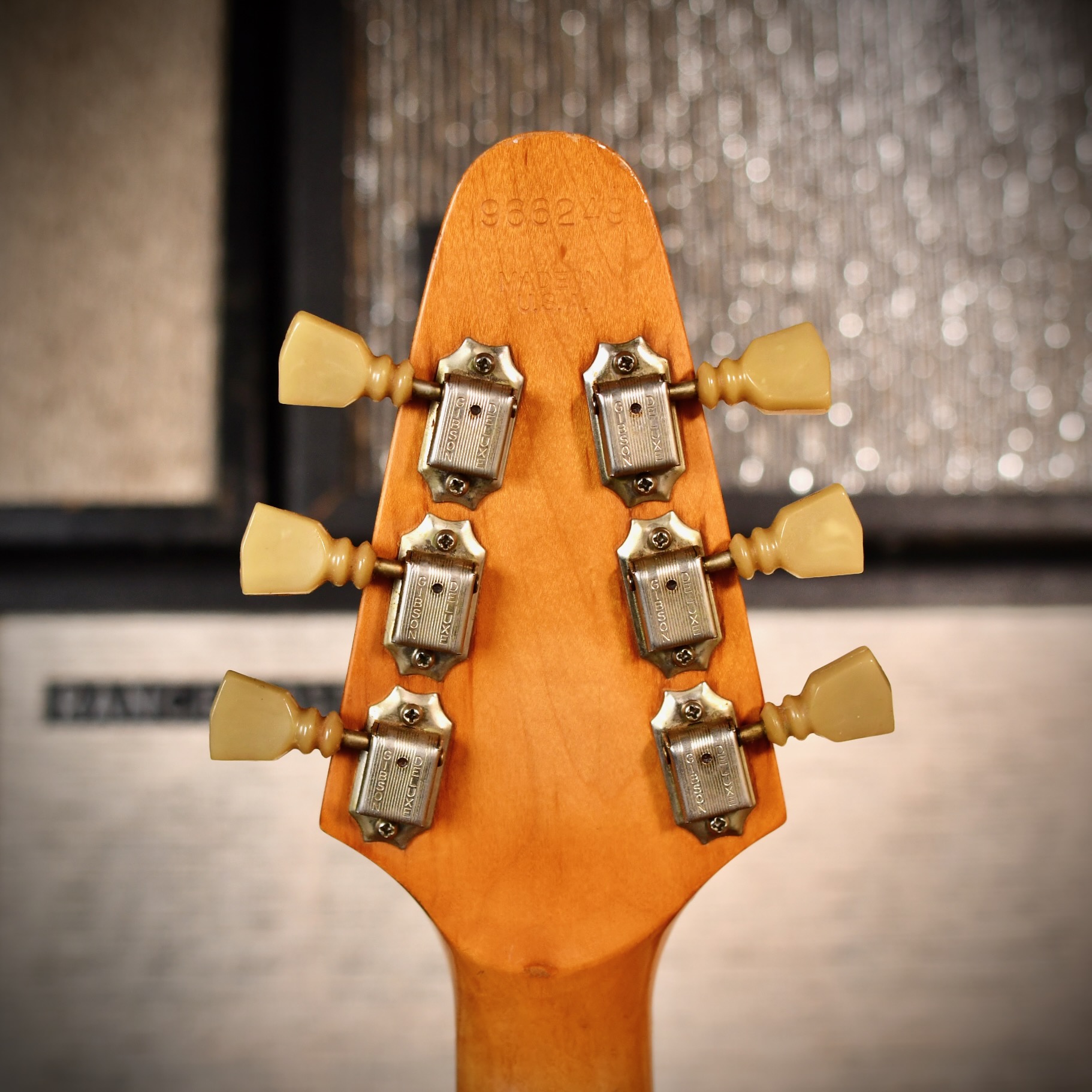 - Headstock: Tapered "Flying V-style" peghead with "Gibson" logo