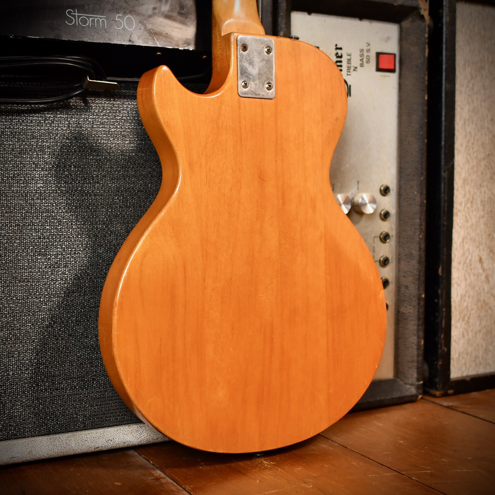 - Controls: 3-way toggle switch located on the treble bout, master volume and tone