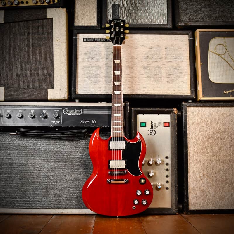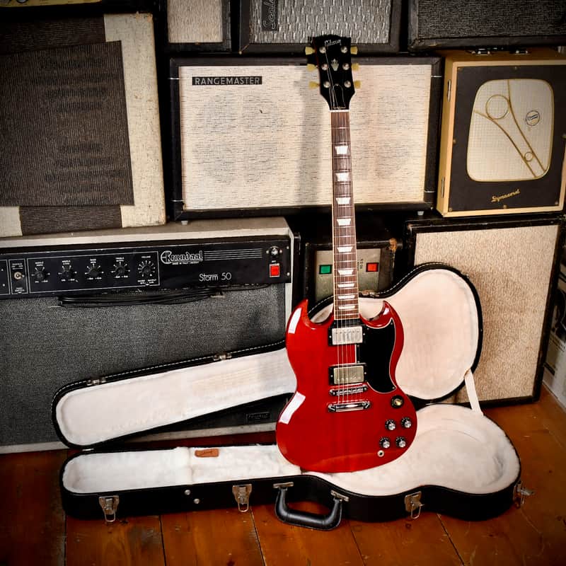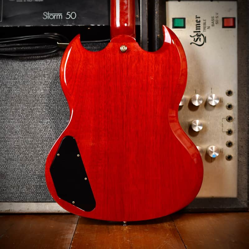 This 2011 Gibson SG '61 Reissue was manufactured as part of Gibson USA's core lineup to emulate the look and feel of the earliest SGs. It features a slim-taper neck profile, which is faster and thinner than many other Gibson models, and a small, vintage-style "teardrop" pickguard, correct to the 1961 design. Unlike some modern SGs with weight relief, this era of the '61 Reissue uses a solid mahogany body. The guitar is equipped with '57 Classic humbucker pickups, designed to capture the warm, full, and dynamic tone of the original "Patent Applied For" (PAF) humbuckers. The translucent cherry finish allows the mahogany grain to show through, adding to its vintage appeal. Notable artists who have famously wielded SGs (both vintage and reissues) include Angus Young of AC/DC, Tony Iommi of Black Sabbath, Pete Townshend of The Who, and George Harrison of The Beatles.
