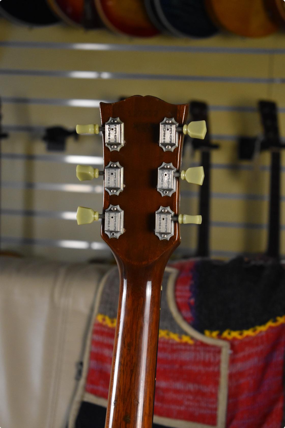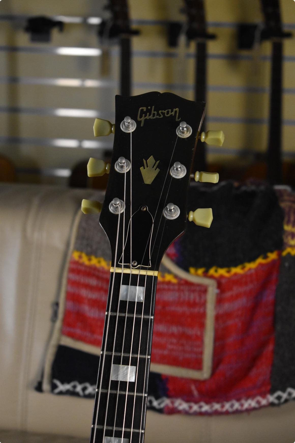 This example is in good condition for over 50 years old, having been well used but also cared for. The guitar remains in original condition except for later Gibson replacement tuners, and a recent professional re-fret with a new nut that have little play wear. The original finish is in good condition, and the chrome on the hardware has some pitting. There is some clear lacquer over the switch ring, and pickup rings.