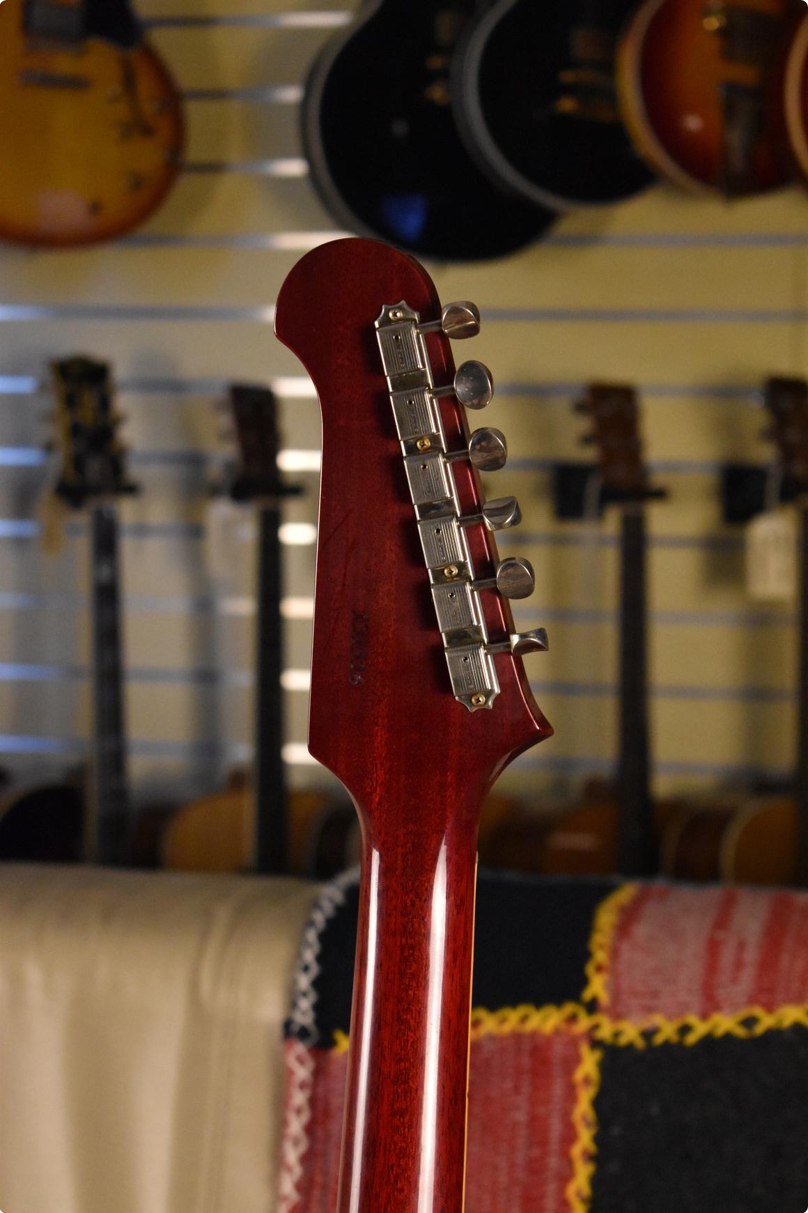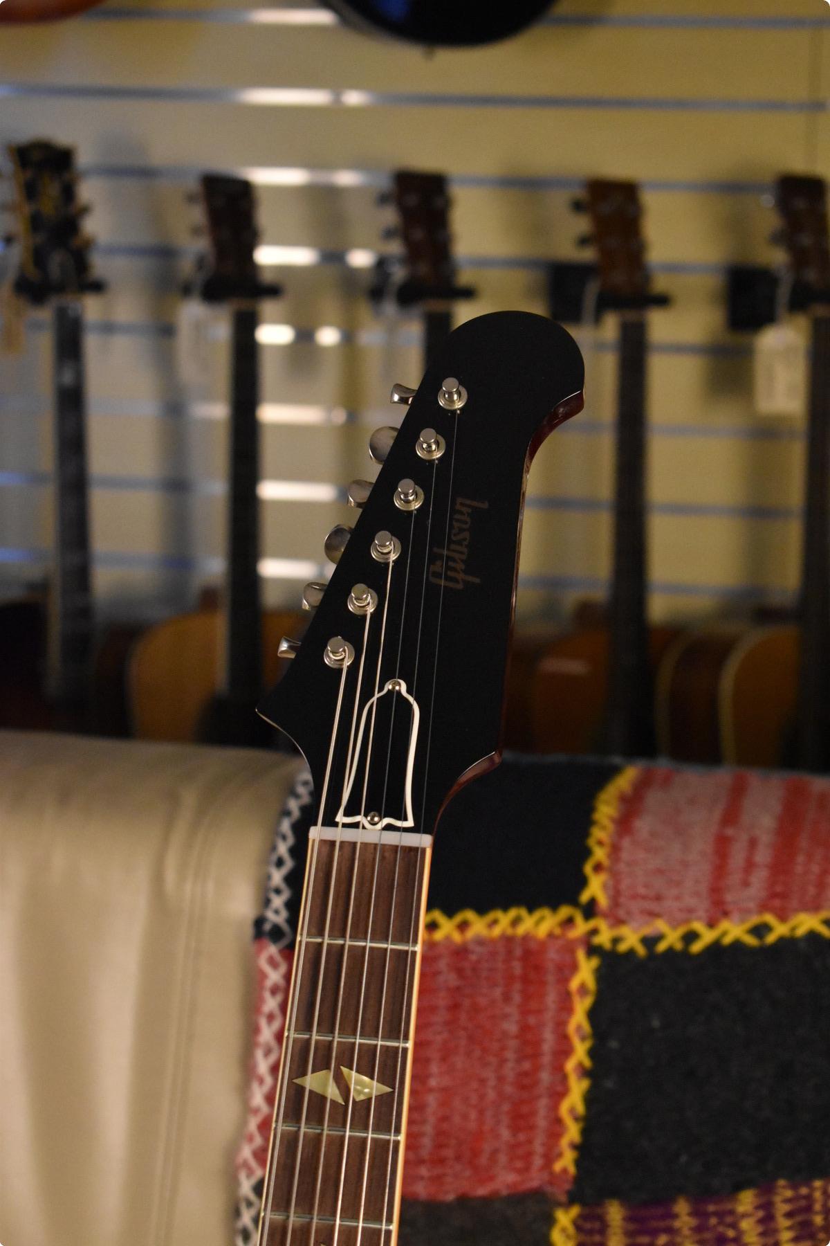 This reissue of a 1964 Gibson Trini Lopez features similar specifications to an ES335 of the same year, including the 1&11/16" nut width, and nickel plated hardware. Other specifications include diamond f-holes, a rosewood inlaid Trini Lopez tailpiece, the Reverse Firebird headstock, Custom-bucker pickups, and the split diamond inlays on the fingerboard.
