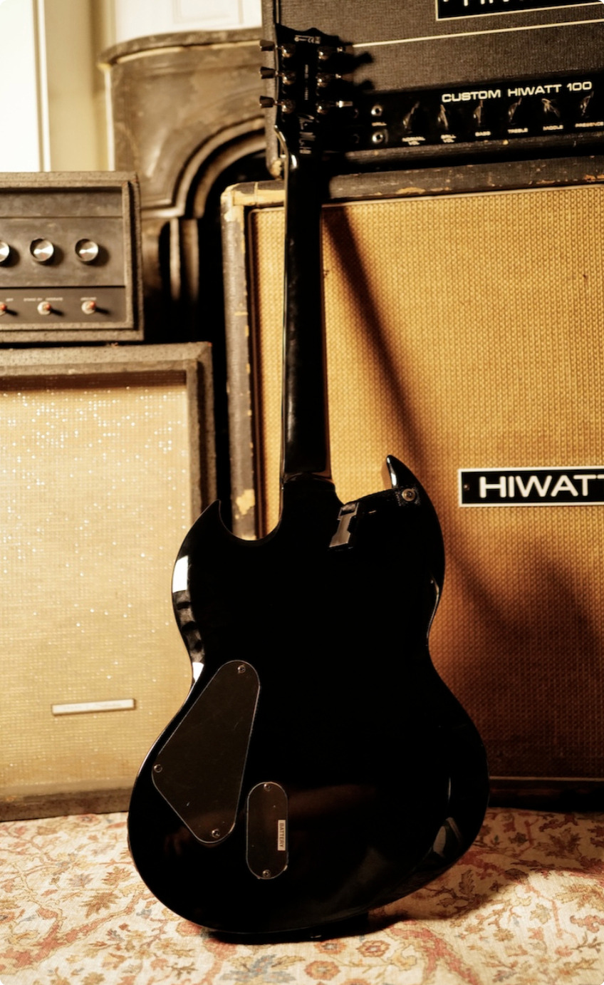 Featuring the model’s distinctive asymmetrical body and finished in black, the instrument shows clear signs of stage use, reflecting its time in a touring environment.