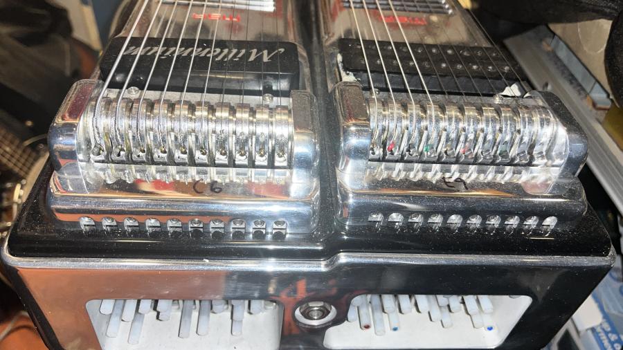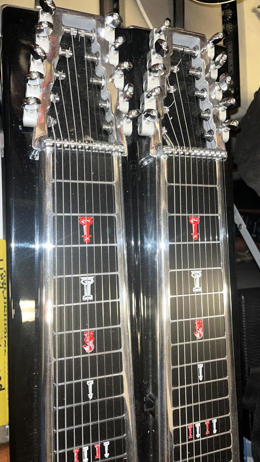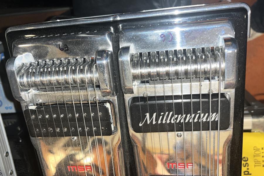 Dubbel D-10, 10 strängar, 8 fotpedaler, 5 knäpedaler, övre halsen stämd i E9 och nedre i C6.