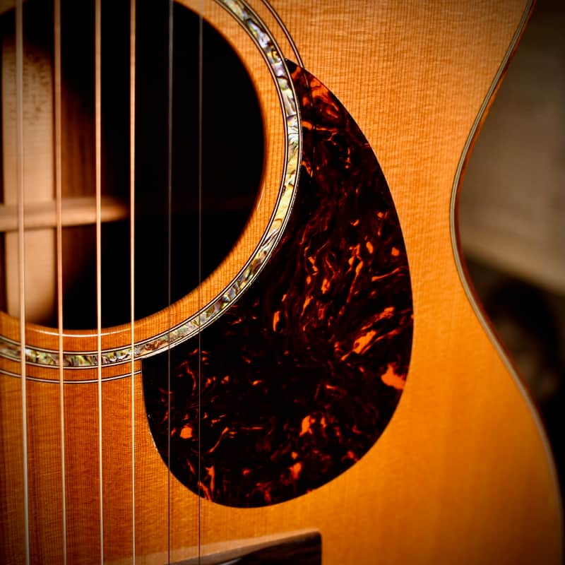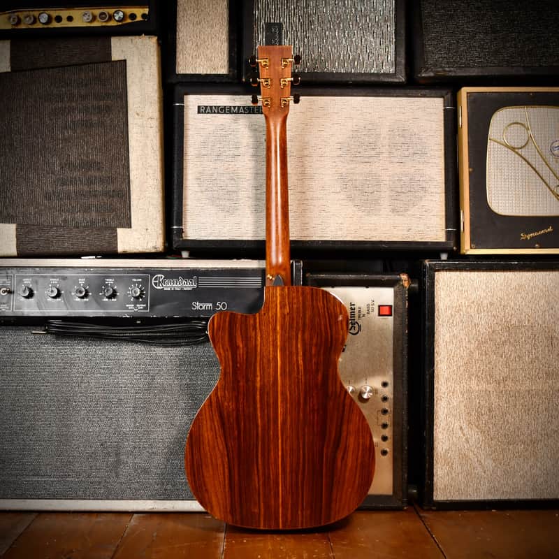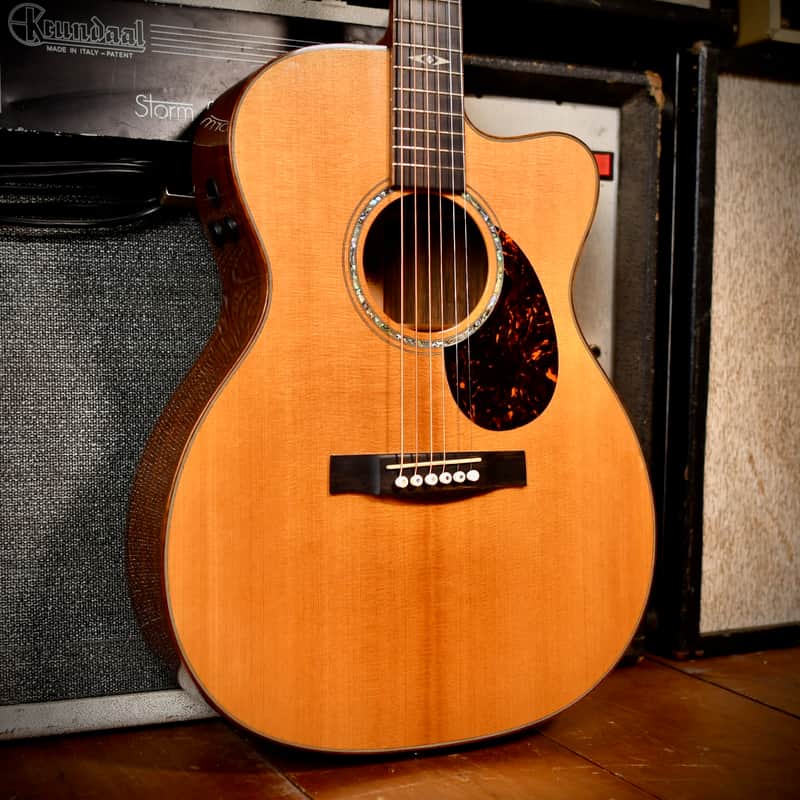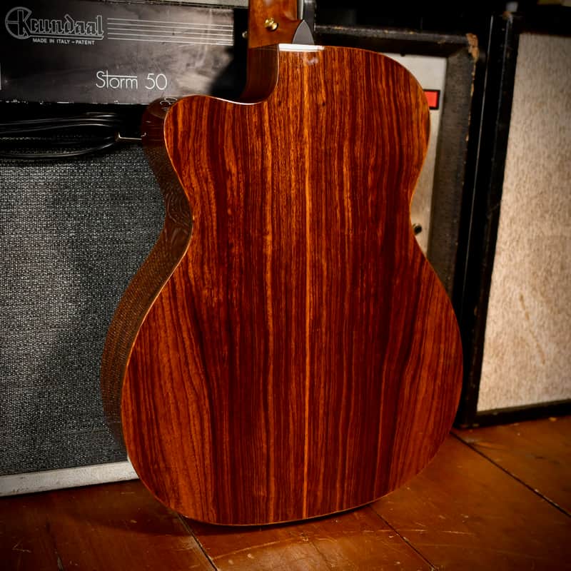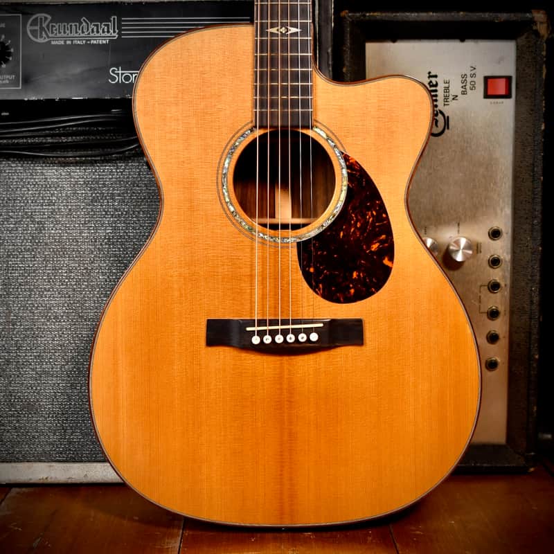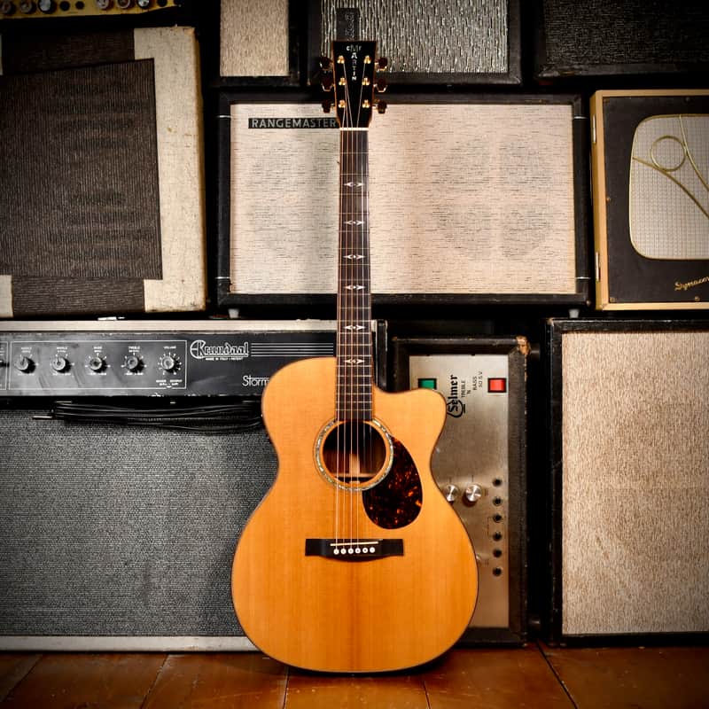The Martin OMCPA1 (Orchestra Model Cutaway Performing Artist 1) was the flagship of Martin’s "Performing Artist Series” in the 2010s, designed to compete with high-end modern acoustic-electrics by offering a slimmer, "electric-like" neck and advanced onboard electronics. The three-model lineup included the DCPA1 (Dreadnought) and GPCPA1 (Grand Performance). Martin developed this series specifically for gigging musicians, with a neck profile that is slimmer and faster than traditional Martin necks, making lead lines and barred chords easier for those used to electric guitars. The model aslo featured the Fishman F1 Aura system. Unlike standard pickups, the Aura uses "images" (studio recordings of that specific model with high-end microphones) which can be blended with the undersaddle pickup for a more natural, "mic'd up" sound on stage. The "1" in the model name signifies it as the top-tier version, featuring premium tonewoods (solid East Indian Rosewood and Sitka Spruce) and high-end appointments like abalone inlays and gold hardware.