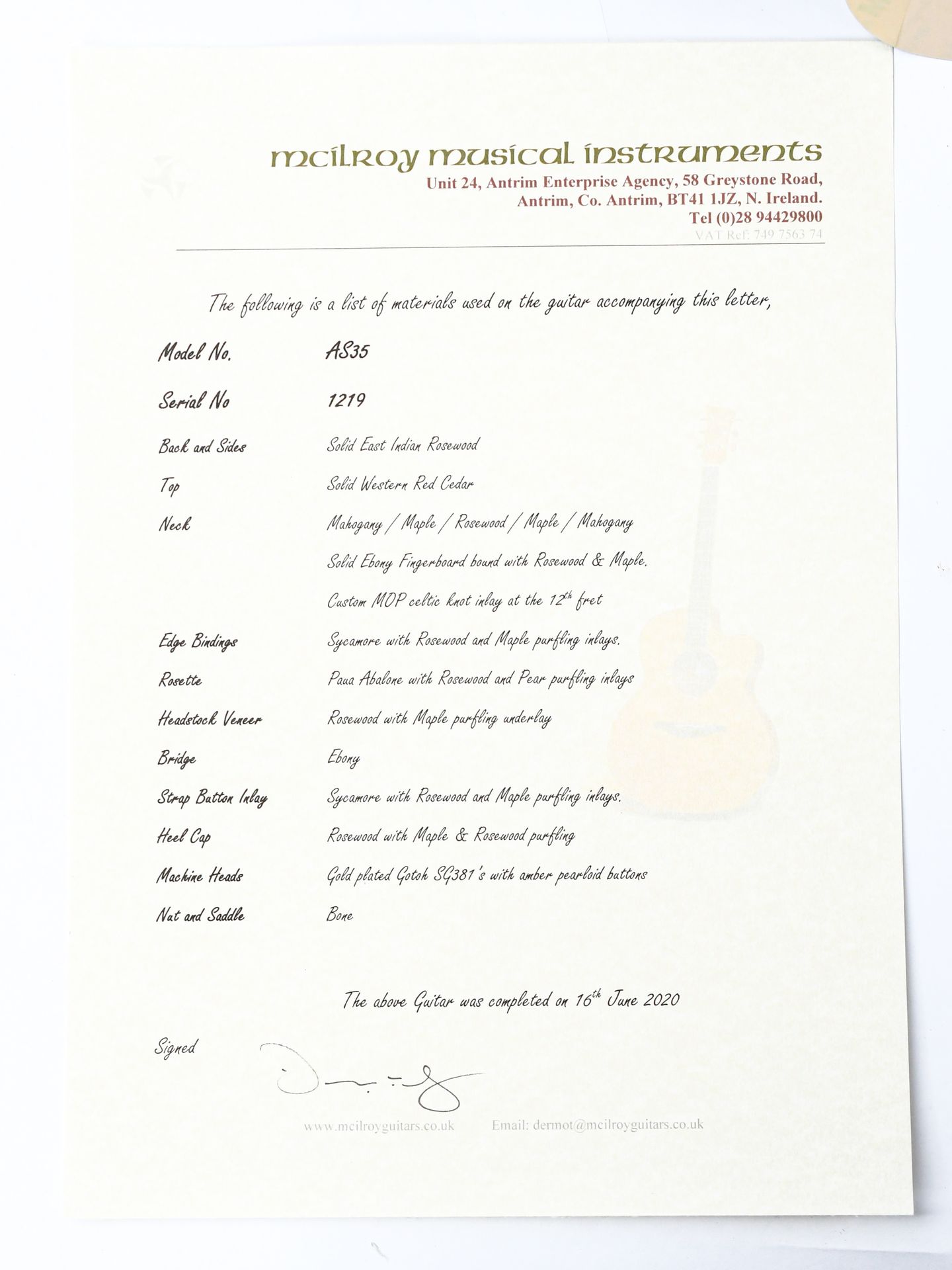 Call for Online Order+31(0)523-23-2205 our policy:14 day money in return return warranty Shipping cost, and Customs & import return costs -bothways- are buyers responsibility1 year Guarantee on Used Guitars5 years Guarantee on New guitars (or 'limited lifitime' if the Builder guarrantees such)