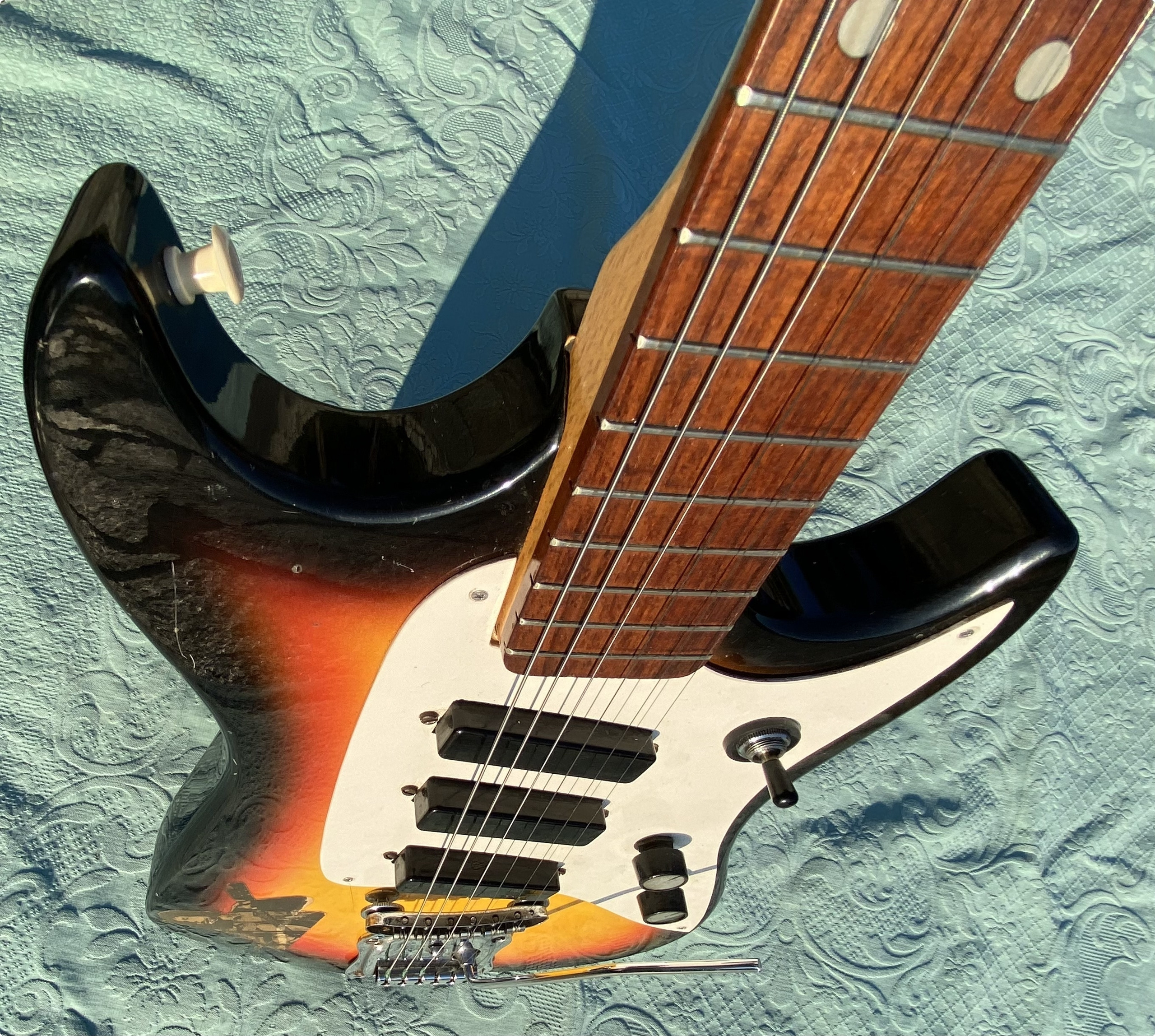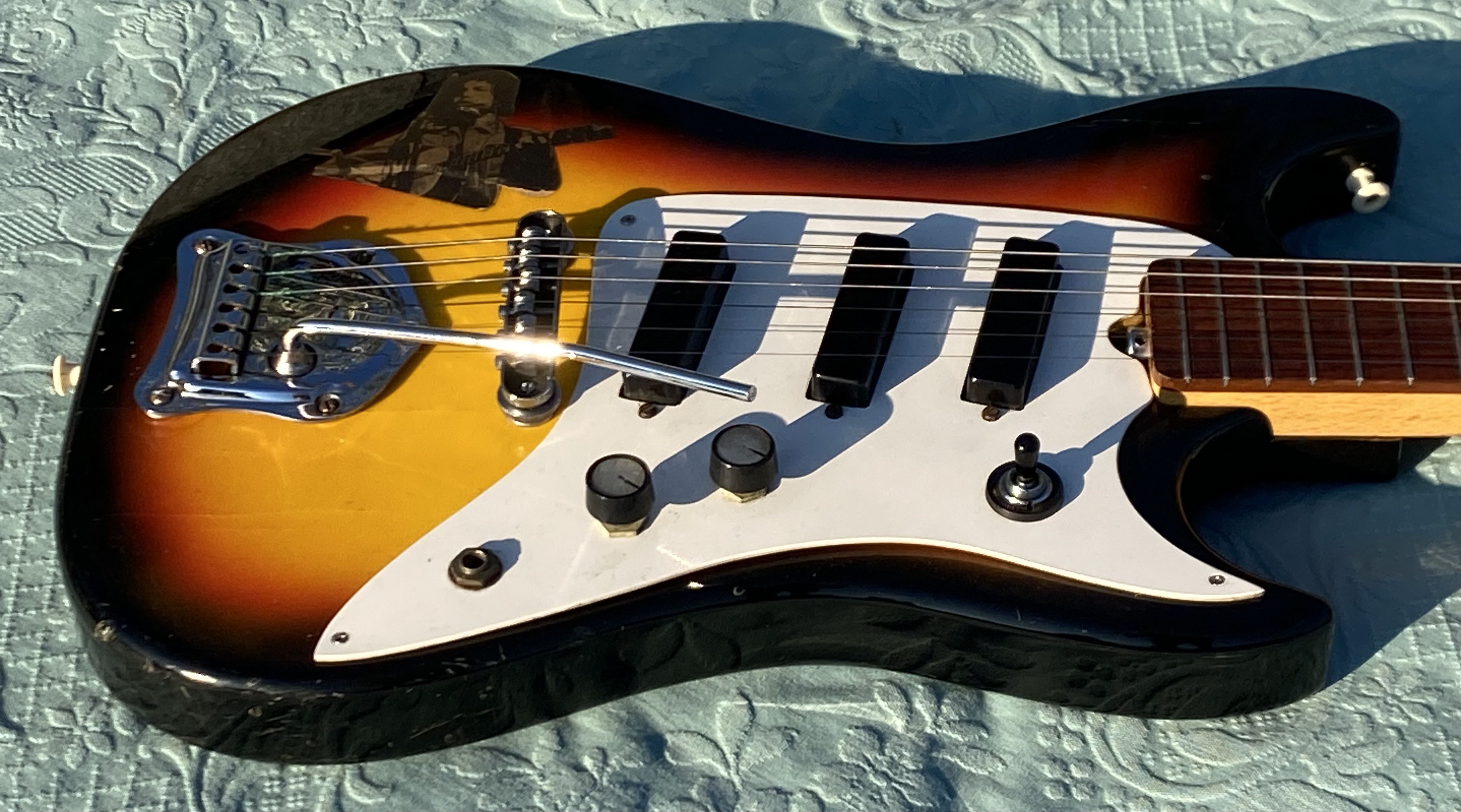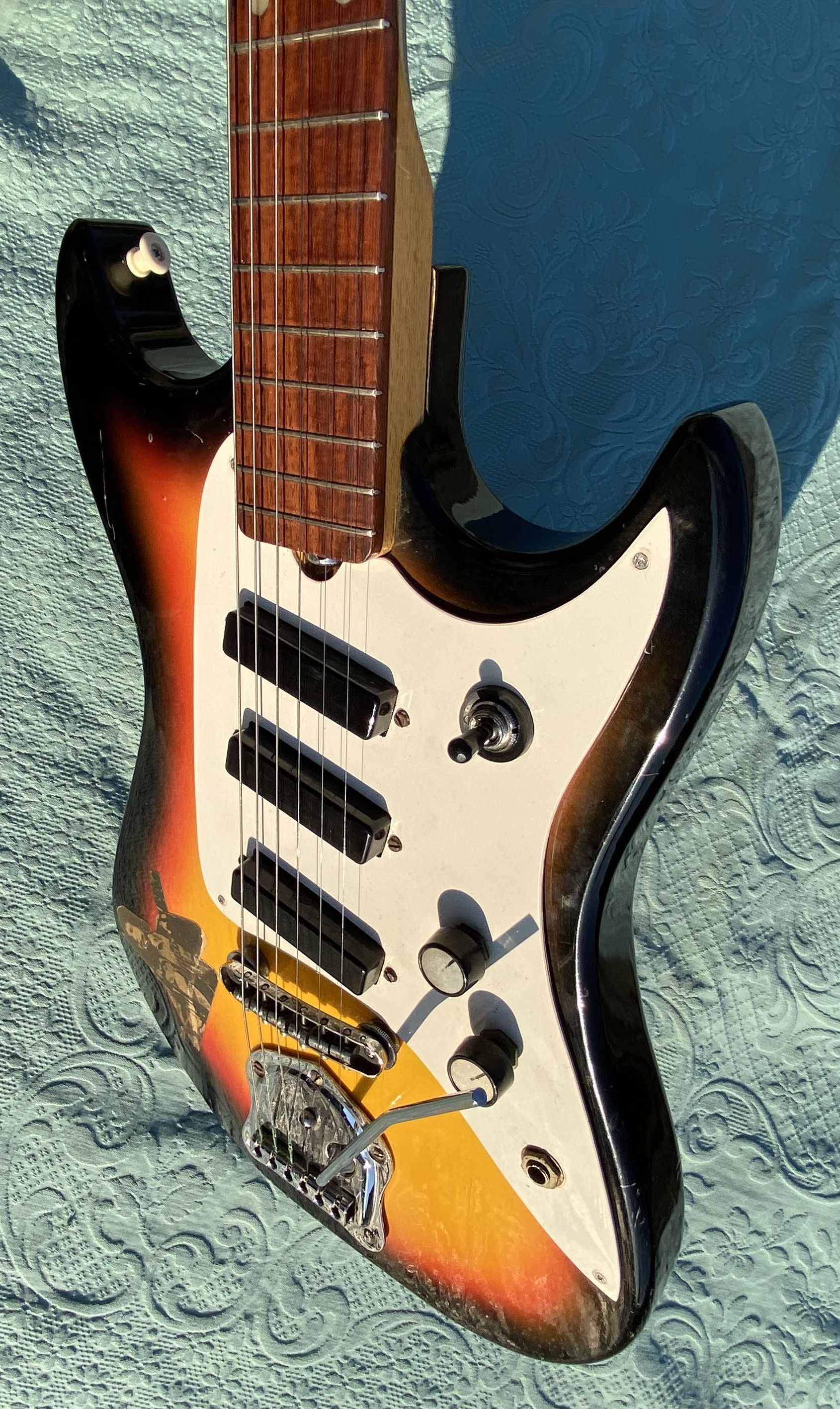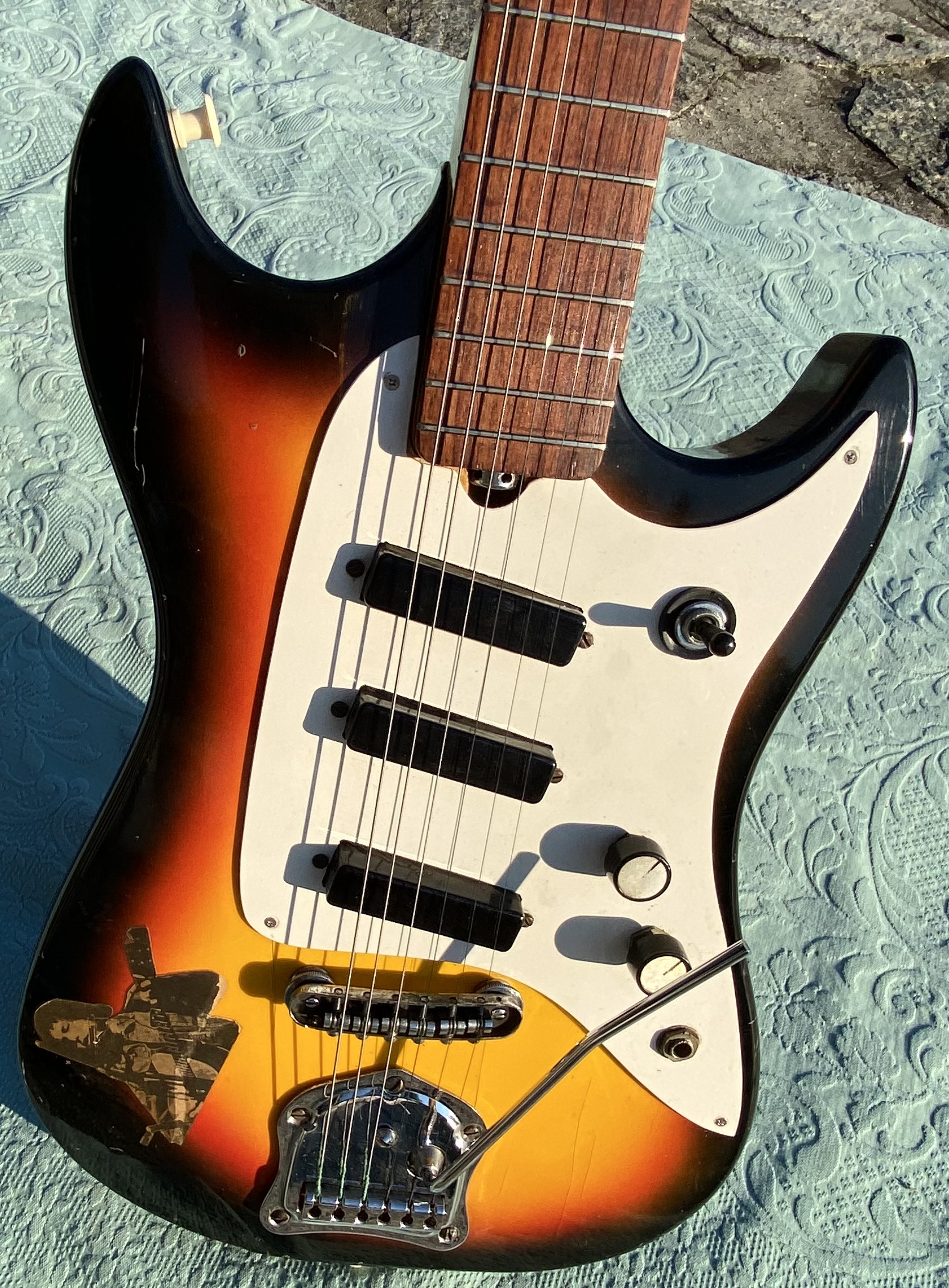 Nice model with straight neck, rosewood fingerboard, good frets, low action, all working with 3 pickups single coil and tremolo. 3 Switch pos. Tone and Volum. "Rickenbacker sound" Comes in Gig Bag as you see in photo.