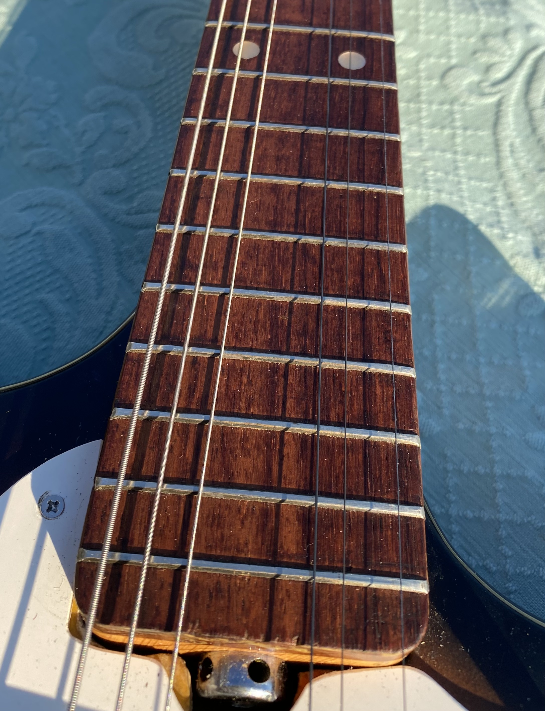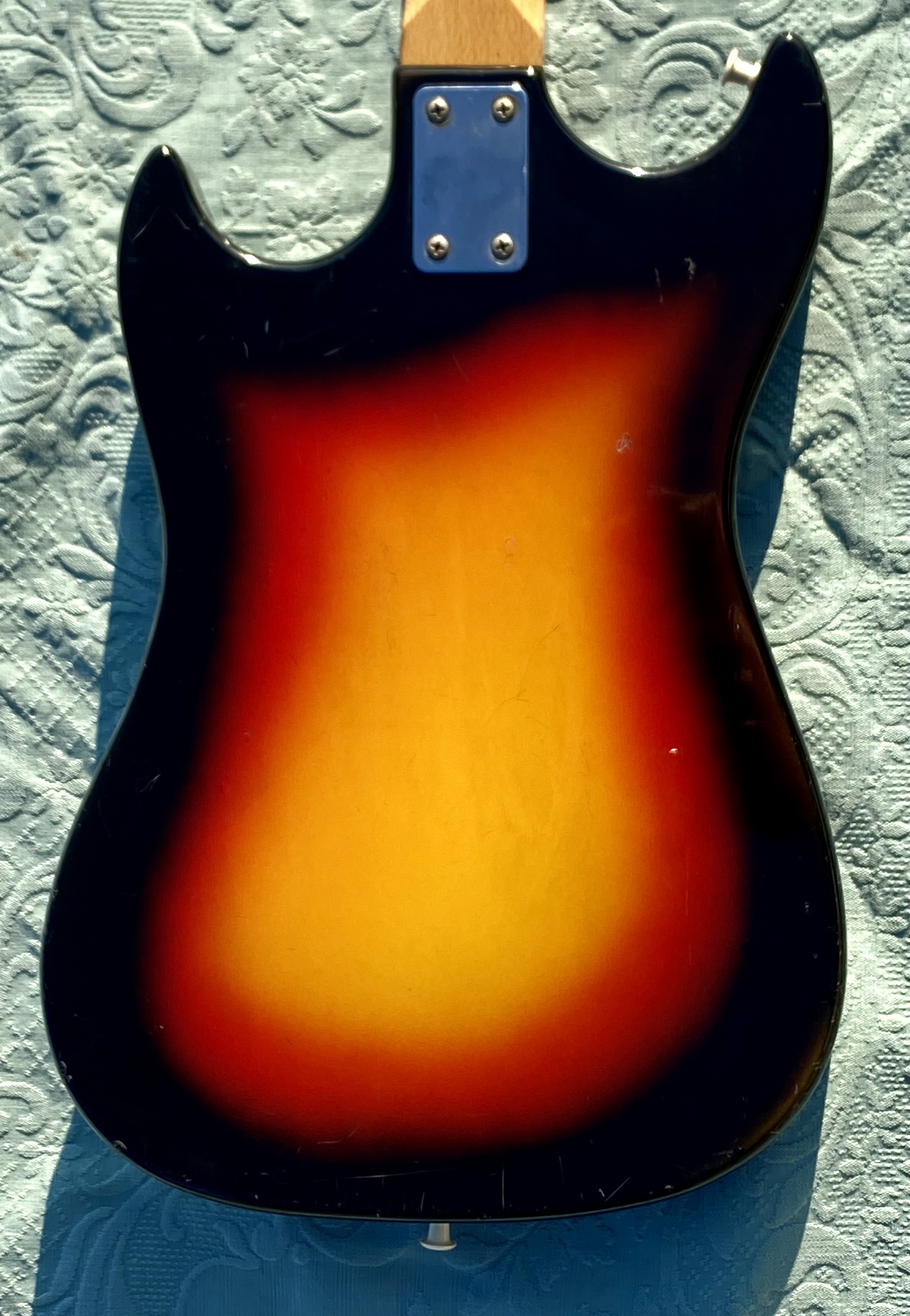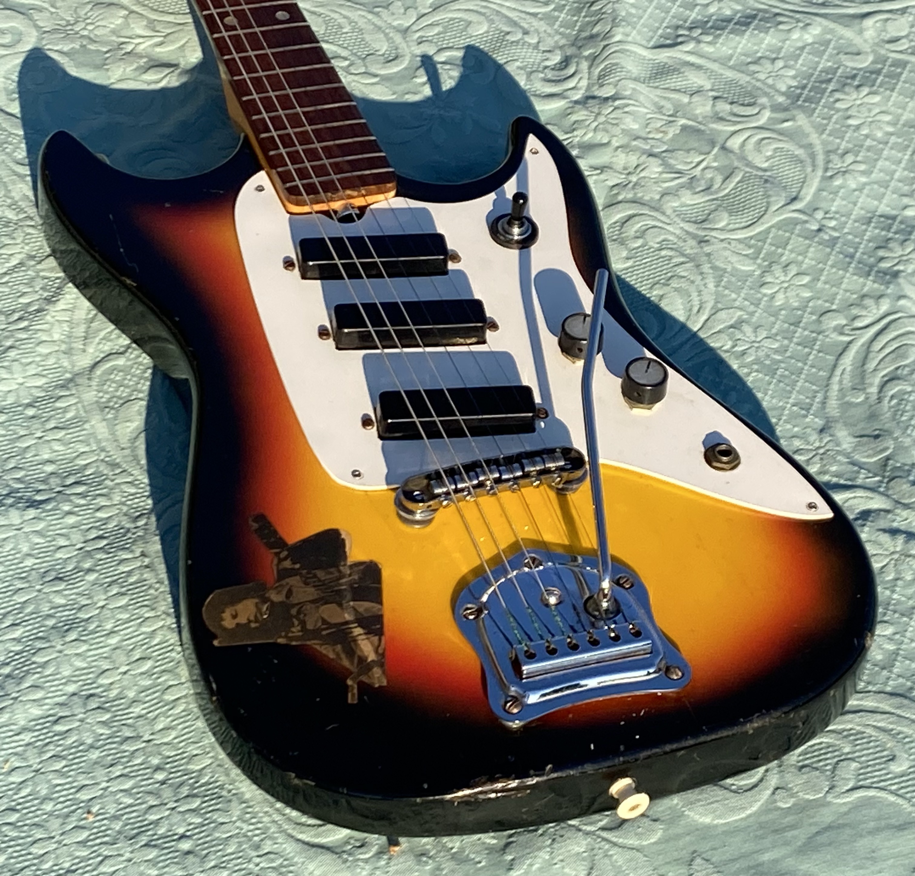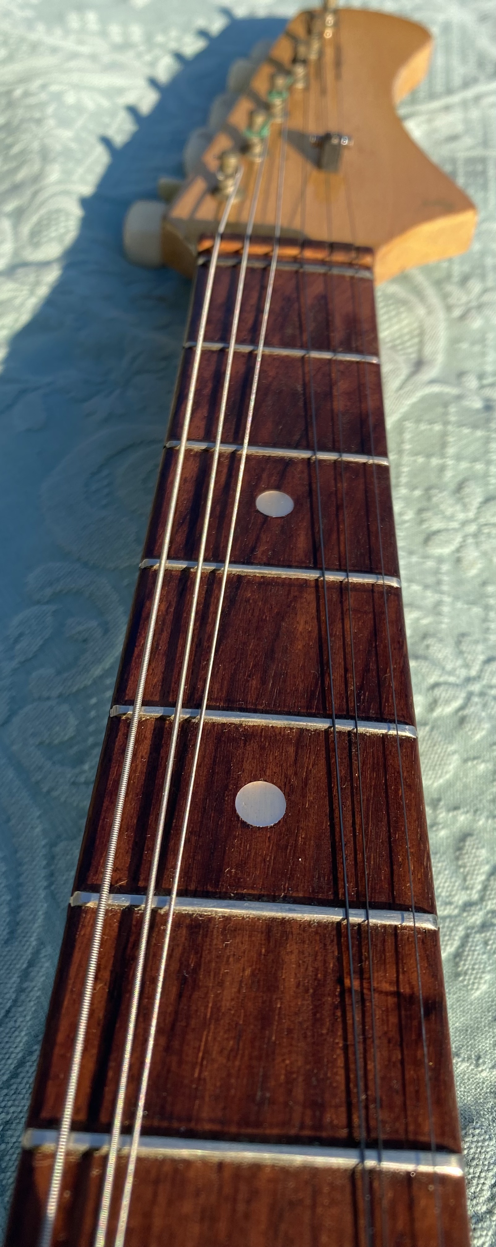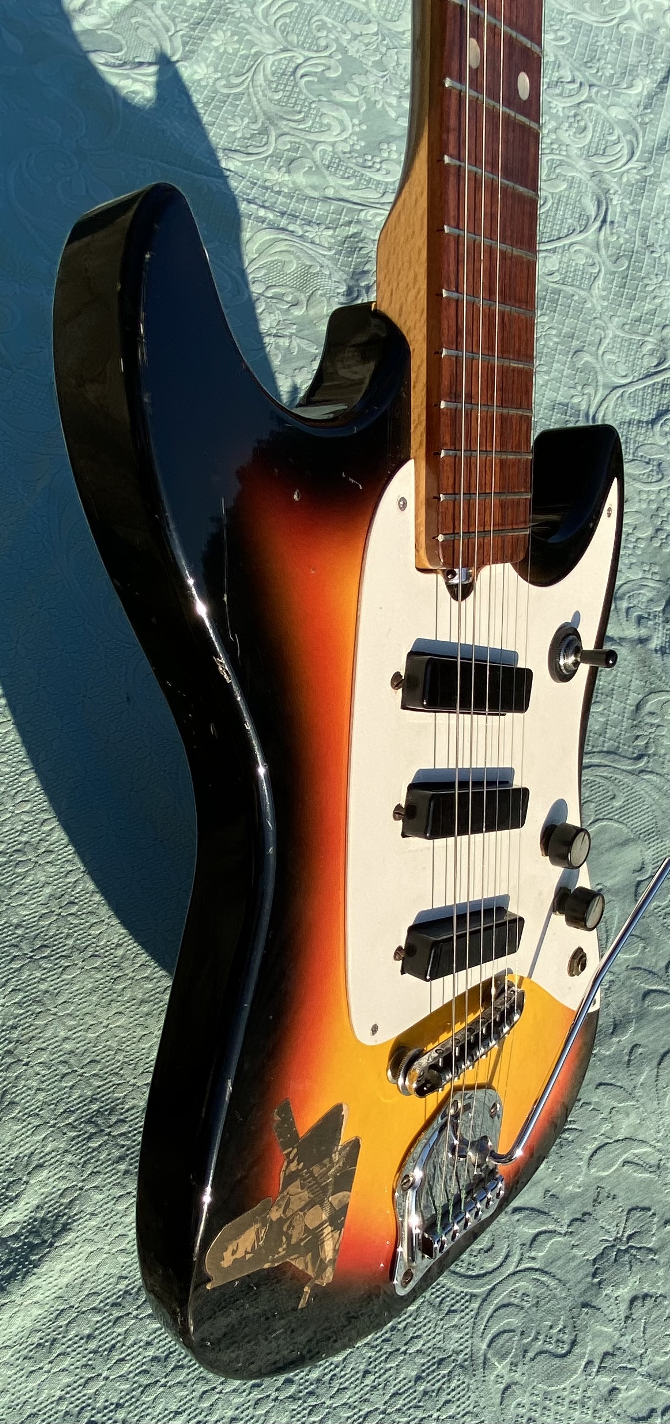 Nice model with straight neck, rosewood fingerboard, good frets, low action, all working with 3 pickups single coil and tremolo. 3 Switch pos. Tone and Volum. "Rickenbacker sound" Comes in Gig Bag as you see in photo.