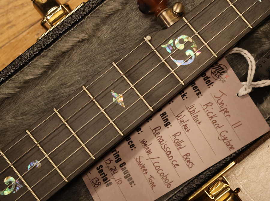 Experience the smooth feel and rich warmth of the hand-selected walnut neck. Intricate custom abalone inlay adds a touch of bespoke beauty, while precision Rickard Cyclone 10:1 tuners ensure flawless tuning stability.