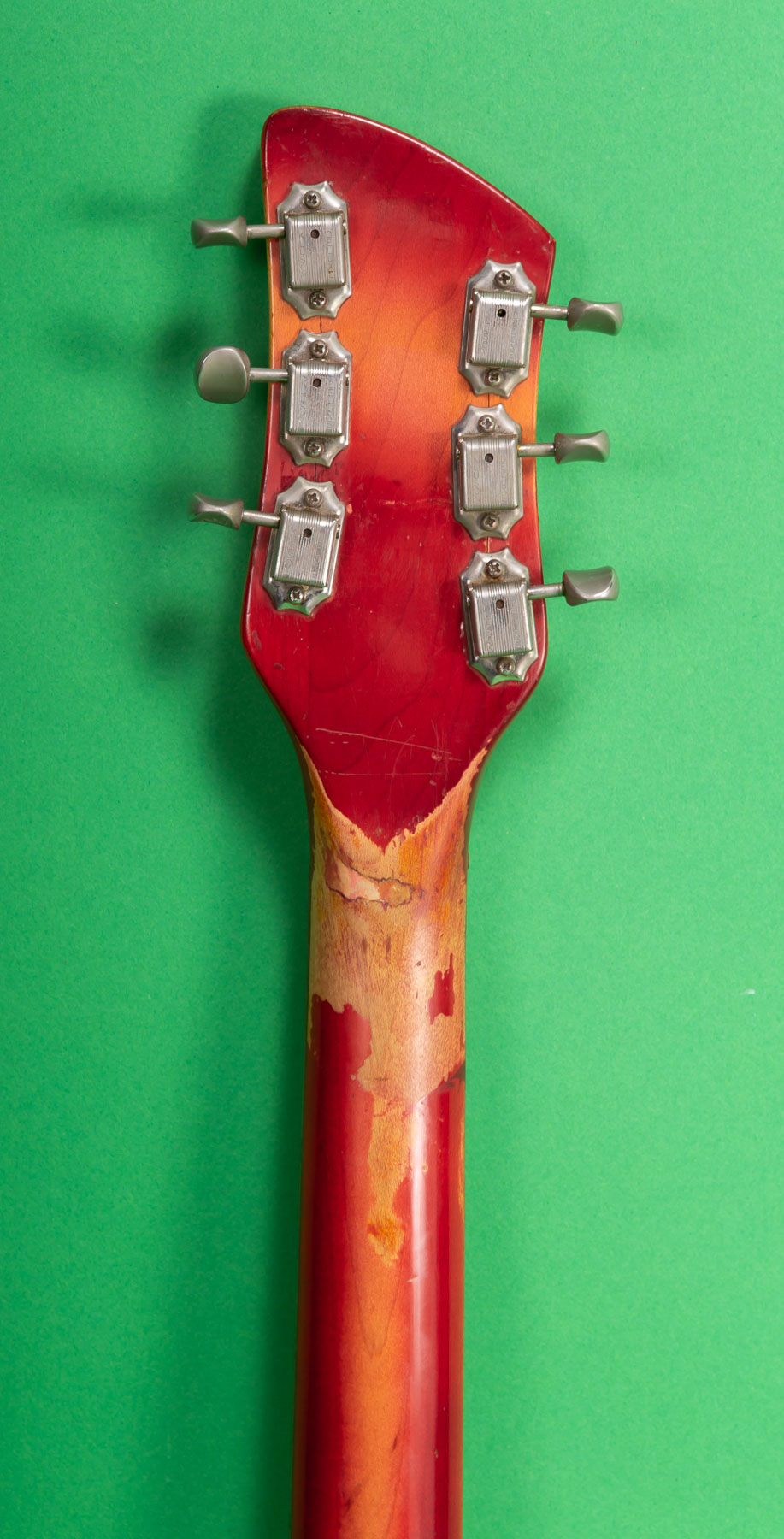Somewhat rare model and usually played by John Lennon or John Fogerty. This one has some un attractive damage behind the nut that looks like wood filler but is not a broken headstock. Beyond that it looks good.