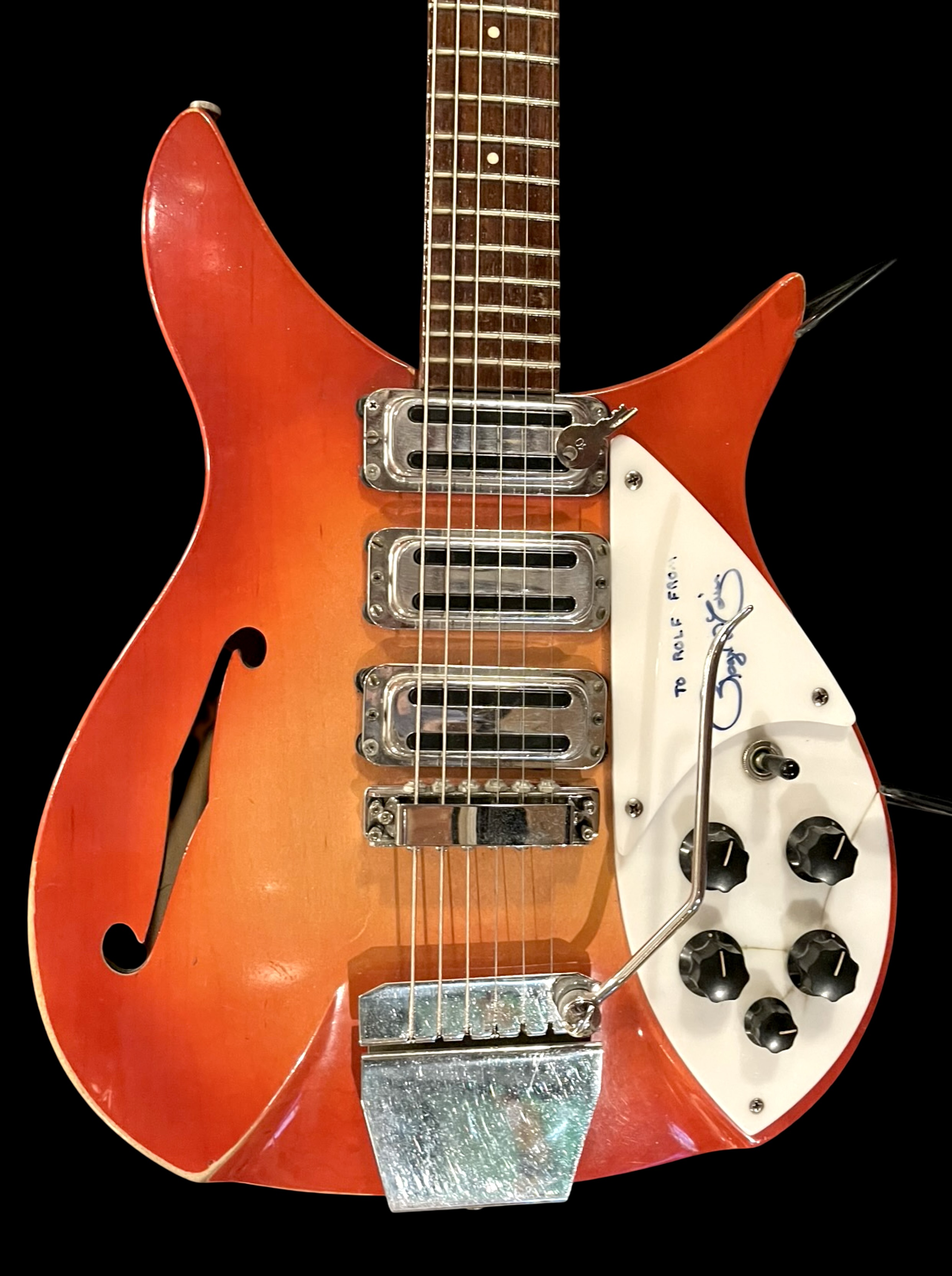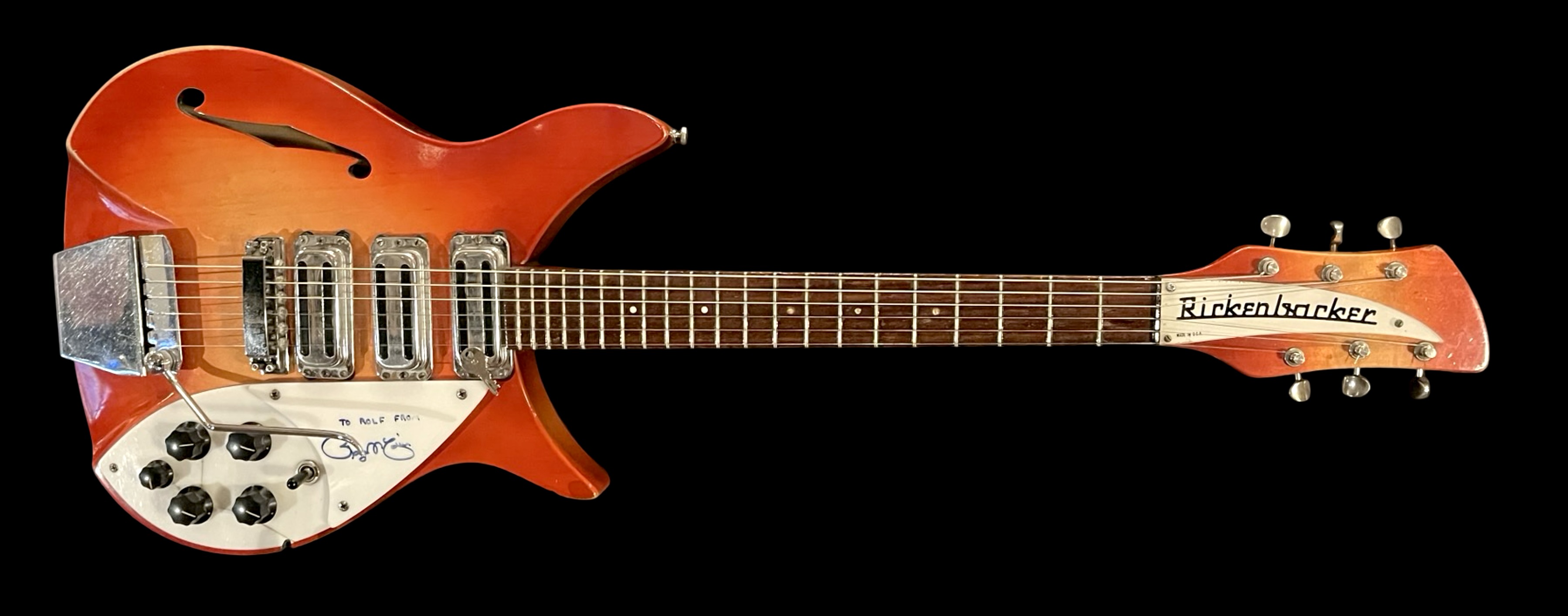 1996 Rose Morris Rickenbacker from 1964 in original Fire Glow, Signed by Roger McGuinn on the pickguard / Comes with original case, Good condition
