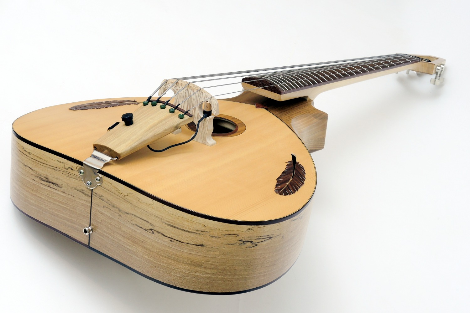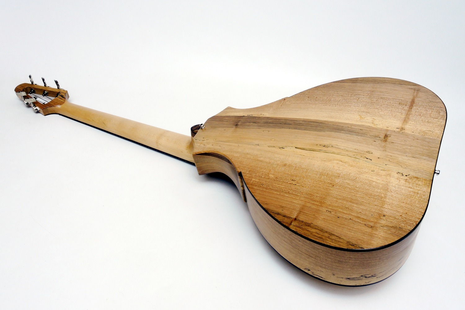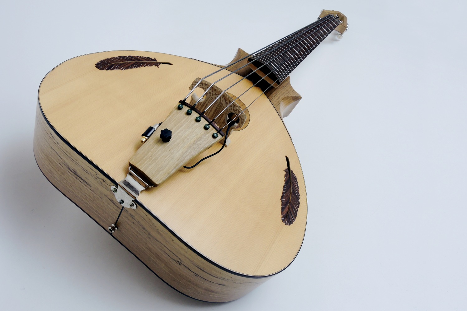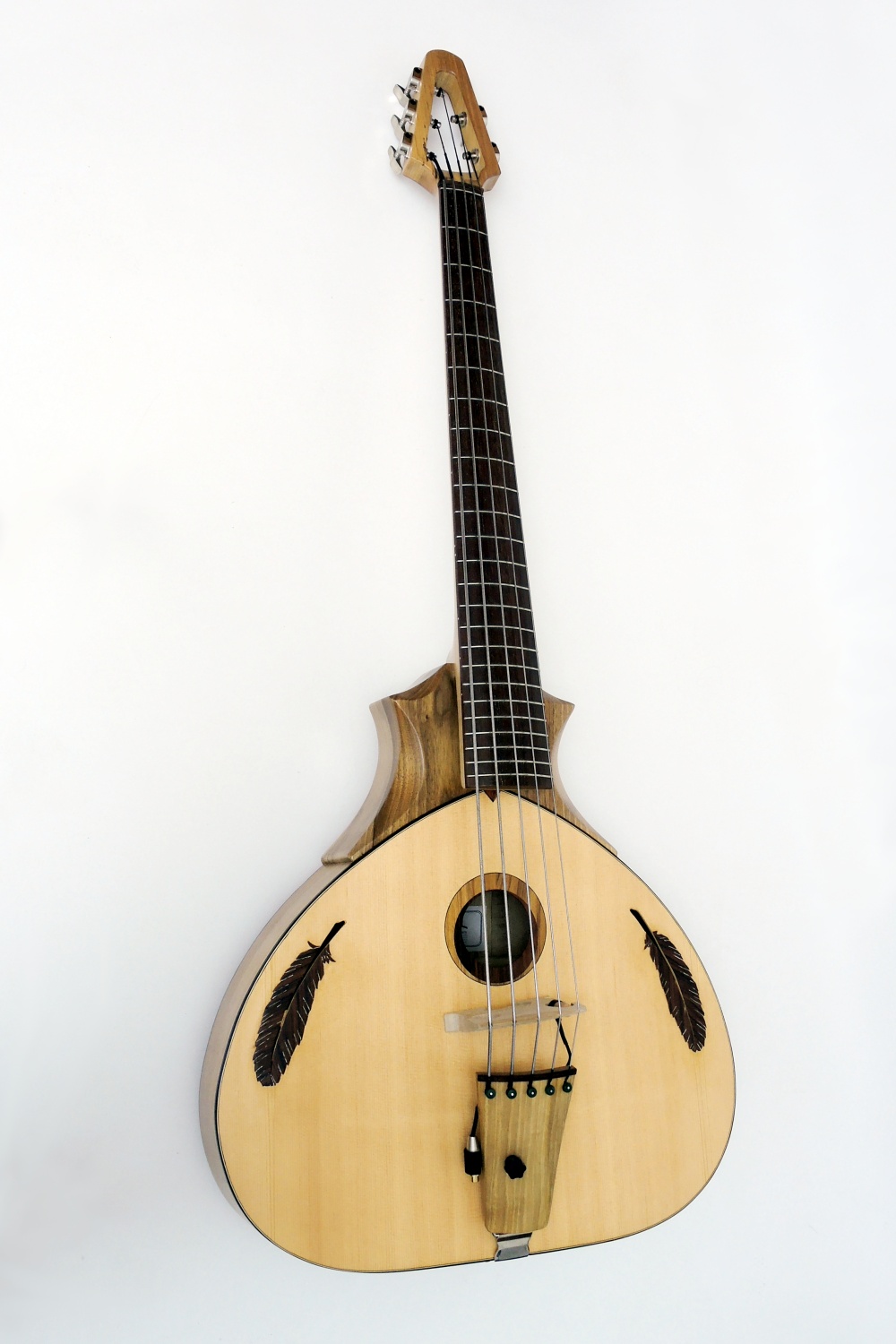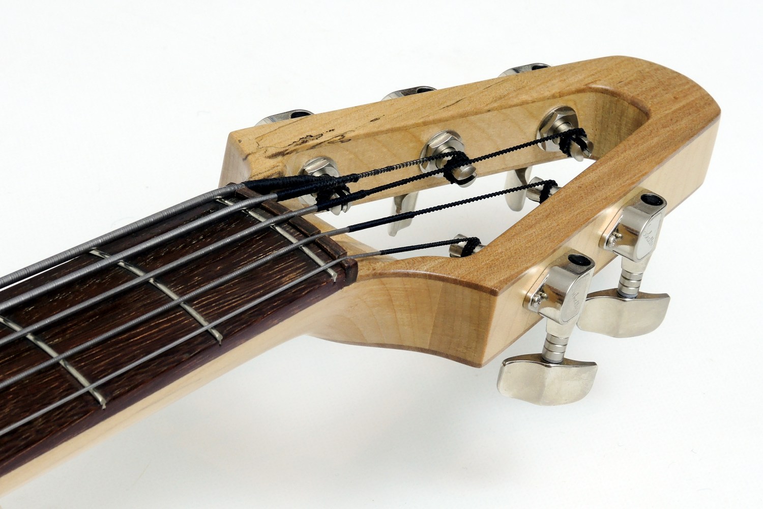 The head shape was chosen to achieve the required stability, because it has to withstand a fairly strong tension. To keep the head still as small as possible, it was equipped with electric bass machine heads. With the usual bass tuners the head would have been twice as long.