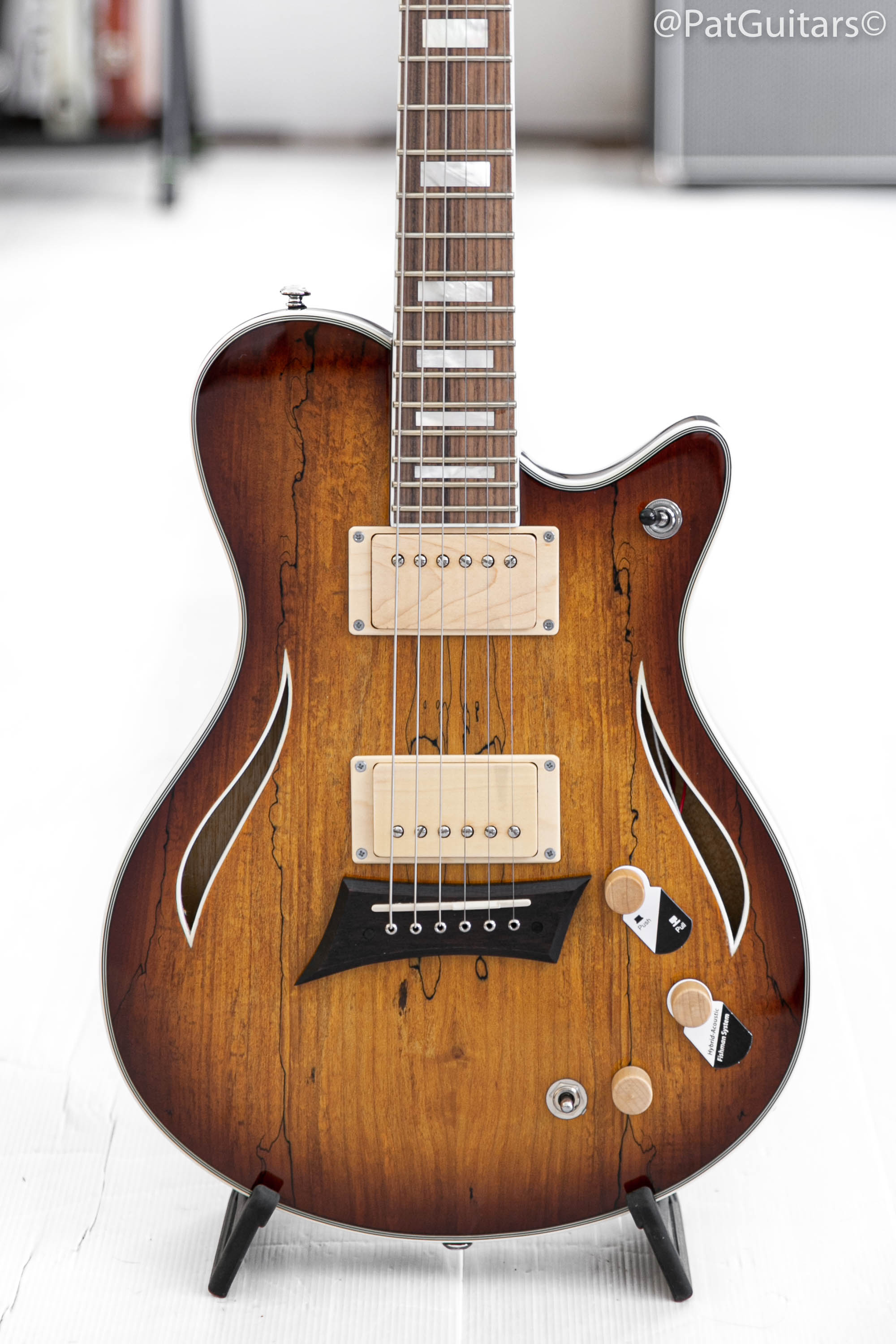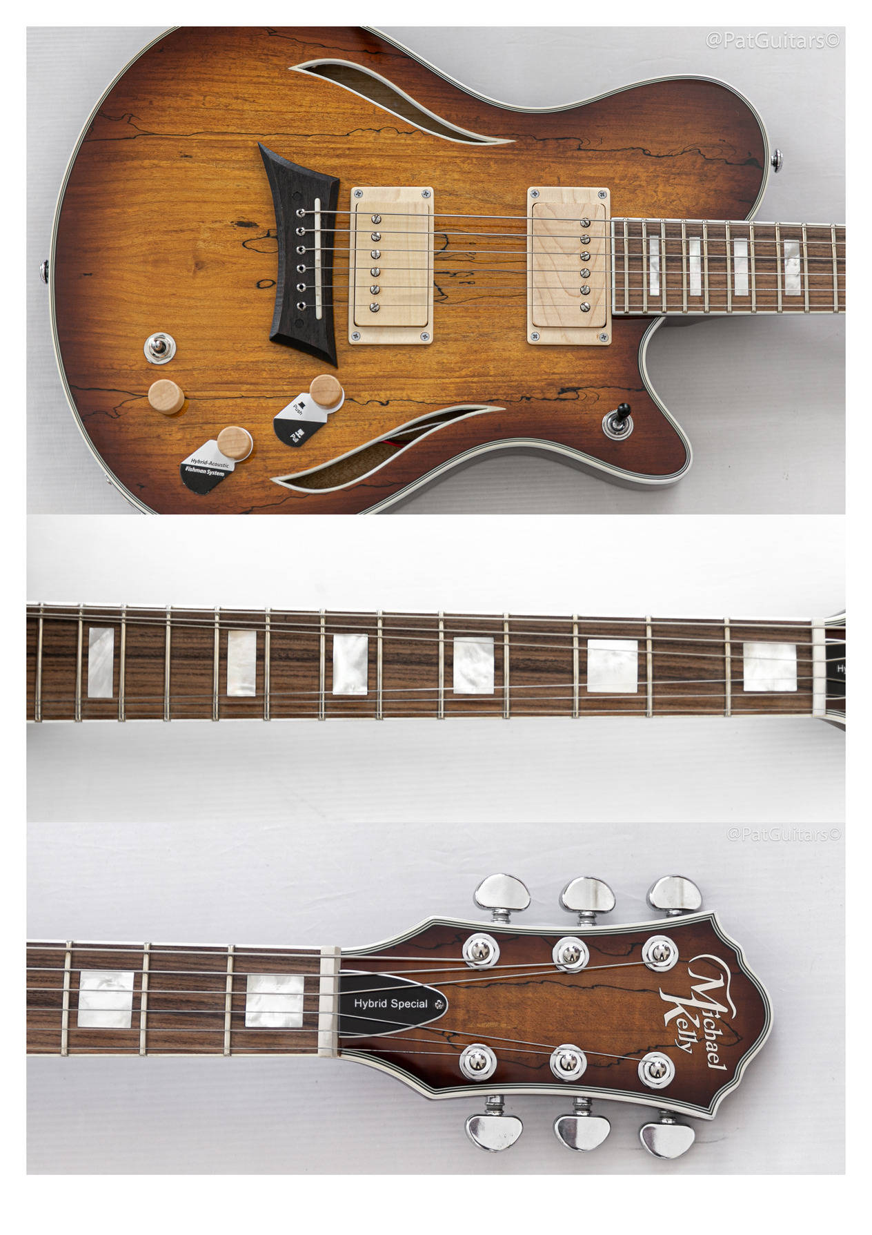 Here for sale is 2025 Michael Kelly MKHYSSPB Hybrid Special in Spalted Burst. Great player and it's in excellent condition. The Hybrid Special allows you to quickly switch from powerful electric guitar tones to big acoustic guitar sounds with the flip of the switch. Thin and lightweight, the chambered semi-hollow body provides acoustic resonance while producing a sweet, clear tone. Two custom-voiced Rockfield SWC humbucker pickups with coil splitting allow the guitar to deliver everything from super clean twang tones to thick drippy drive sounds. A Fishman® under-saddle pickup with Fishman® Powerchip delivers a rich acoustic tone. The electric and acoustic signals are combined when using a standard guitar cable, or separated via a Y-cable to deliver isolated signals to electric or acoustic amplifiers for maximum sonic impact.